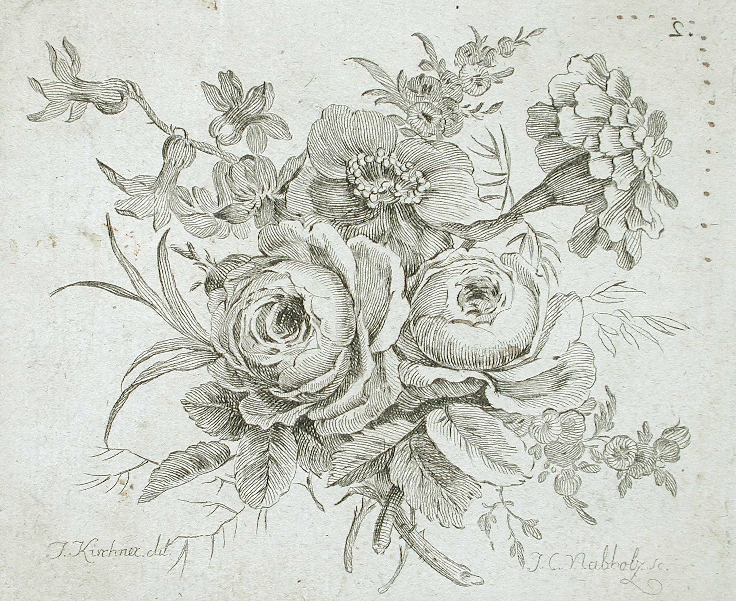 Engraving on pale gray-blue paper depicting a floral bouquet with two large roses, an open-faced anemone, and smaller sprays of buds, rendered in fine hatched lines