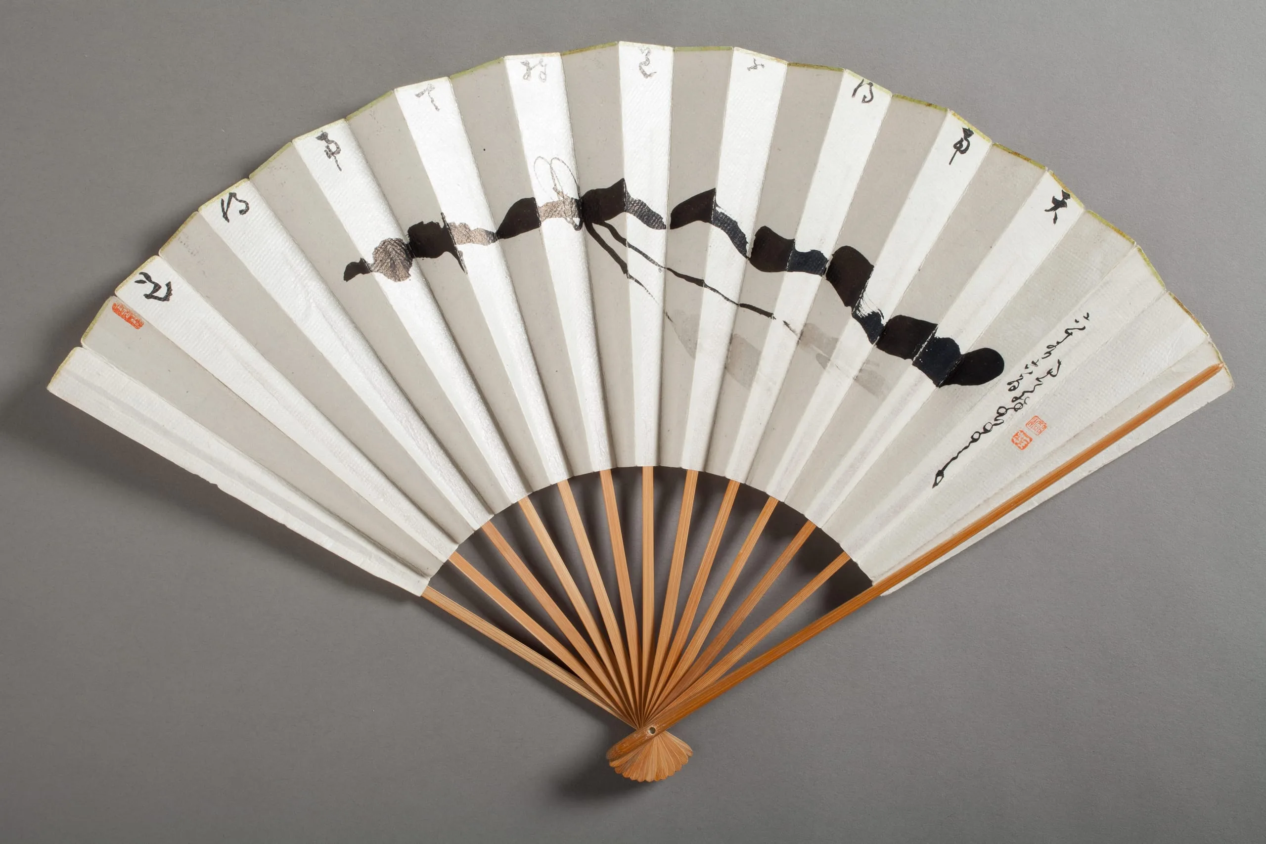 - Fan; bamboo, mica-dusted paper, sumi ink