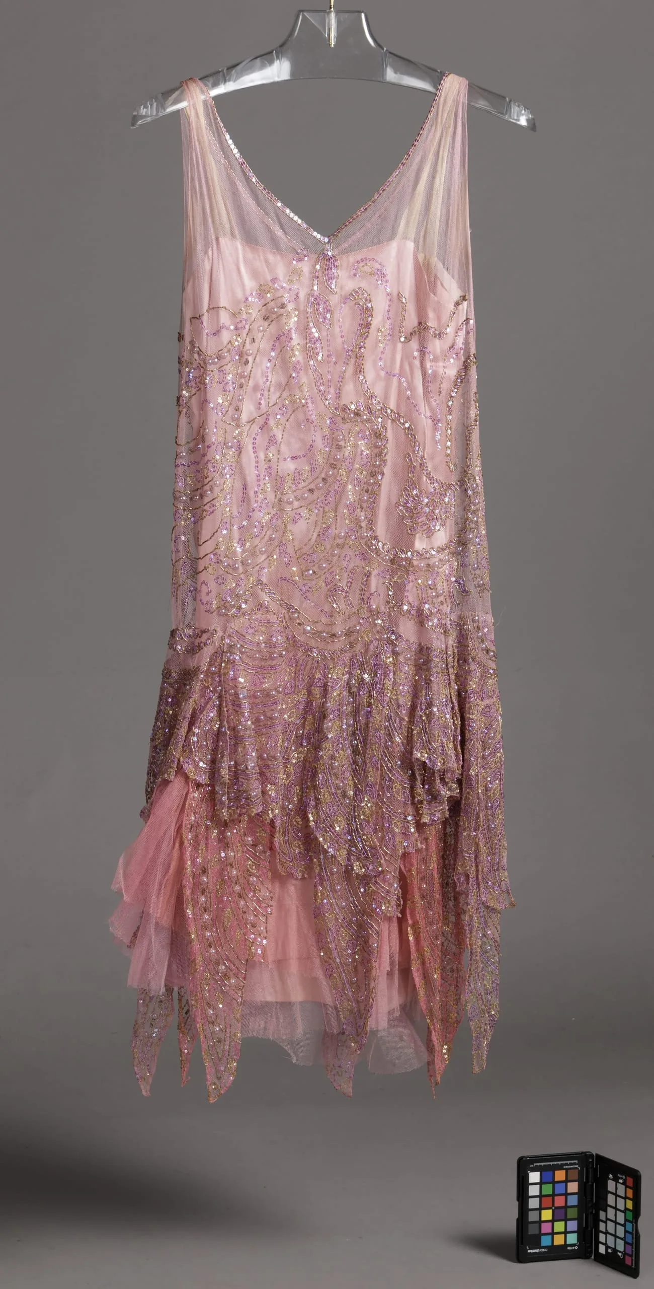 - Dress: silk net with metallic-thread embroidery, metal beads, plastic paillettes and sequins, and metal sequins; Slip: silk satin and silk net