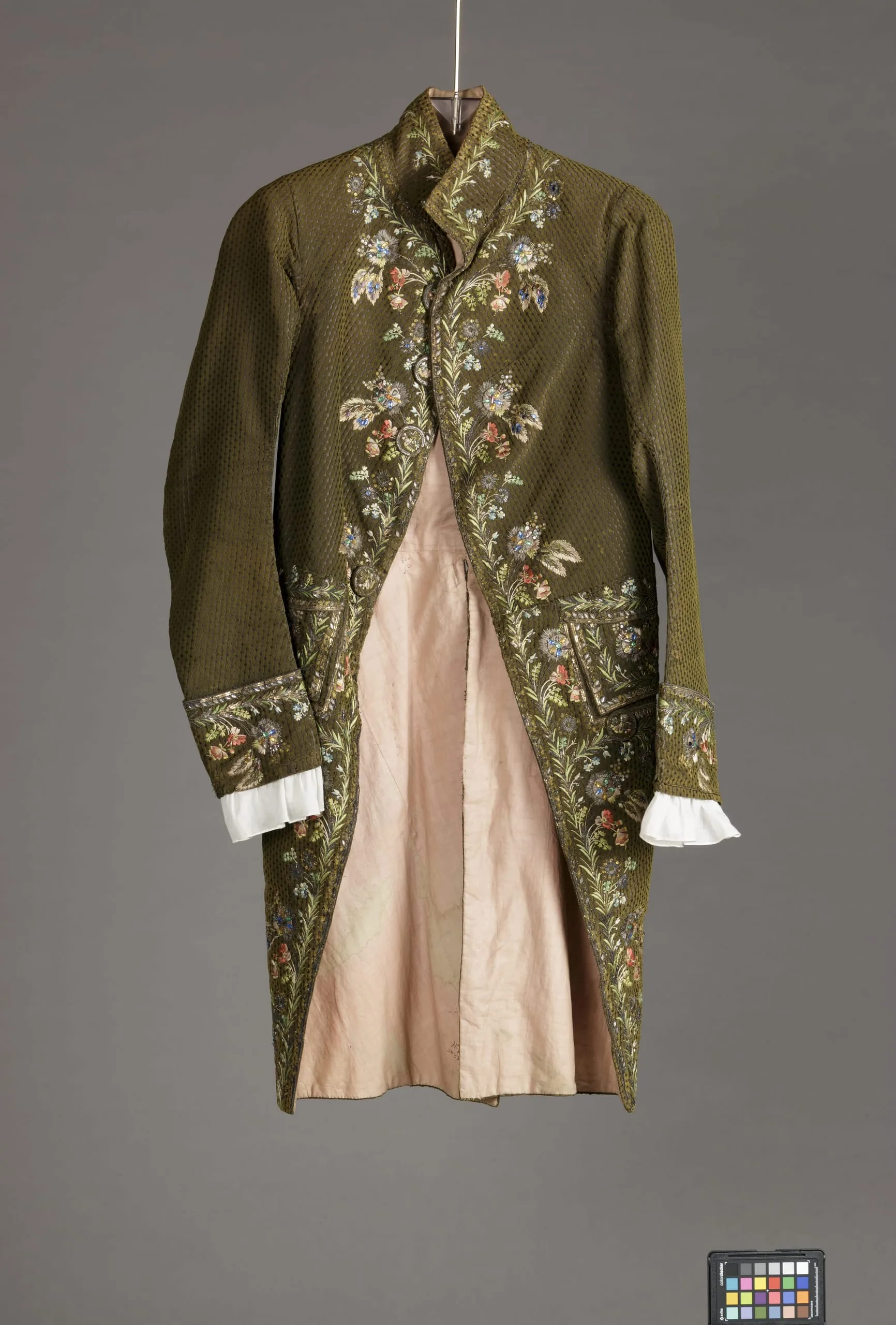 - Silk uncut and voided velvet (ciselé), with silk and metallic-thread embroidery, metal sequins, and paste stones (crystals)