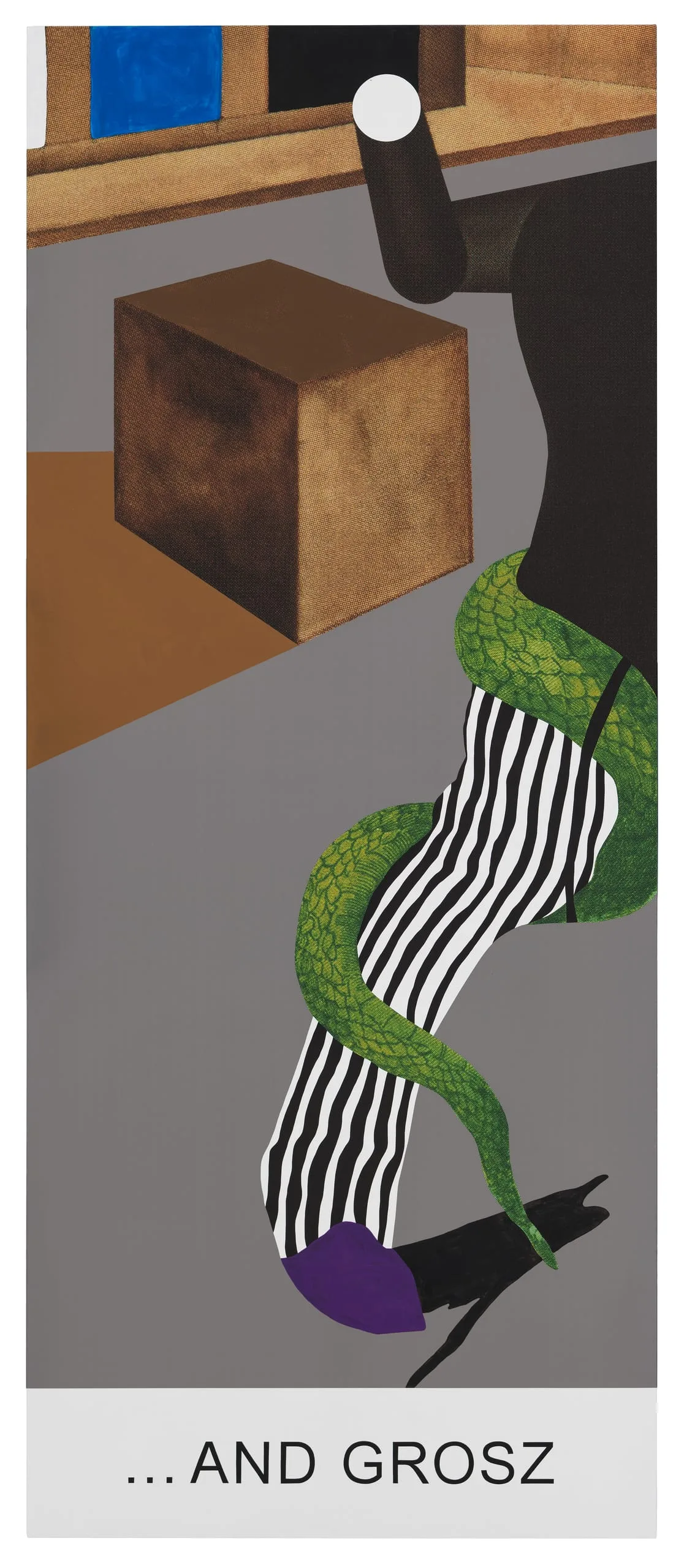 In Double Bill (Part 2):... and Grosz Baldessari reproduces the bottom left corner of George Grosz’s 1920 painting Construction (Untitled), taking its square pedestal and mannequin torso, to which he then adds a leg ensnared by a snake, sourced from Max Ernst’s Untitled (ca.1920). Indeed, neither work perfectly conforms to the styles and subject-matter each artist is primarily known for, and in the case of Grosz, represents a very brief—even atypical—but important period during which the artist made a series of austere, utopian cityscapes variously influenced by constructivism, purism, and Pittura Metafisica. Although, at a first glance, the work seemingly panders to the commonplace understanding of art appreciation as the mastery of artists’ names and their “signature” styles, it ultimately parodies this view through idiosyncratic choices and the playful superimposition of art historical references. Double Bill (Part 2): ... and Grosz is therefore also an invitation to invest time in the act of seeing and to study the overlooked aspects of an artist’s work or career, providing the opportunity to rethink how we relate to art and how artists relate to the rest of the world.