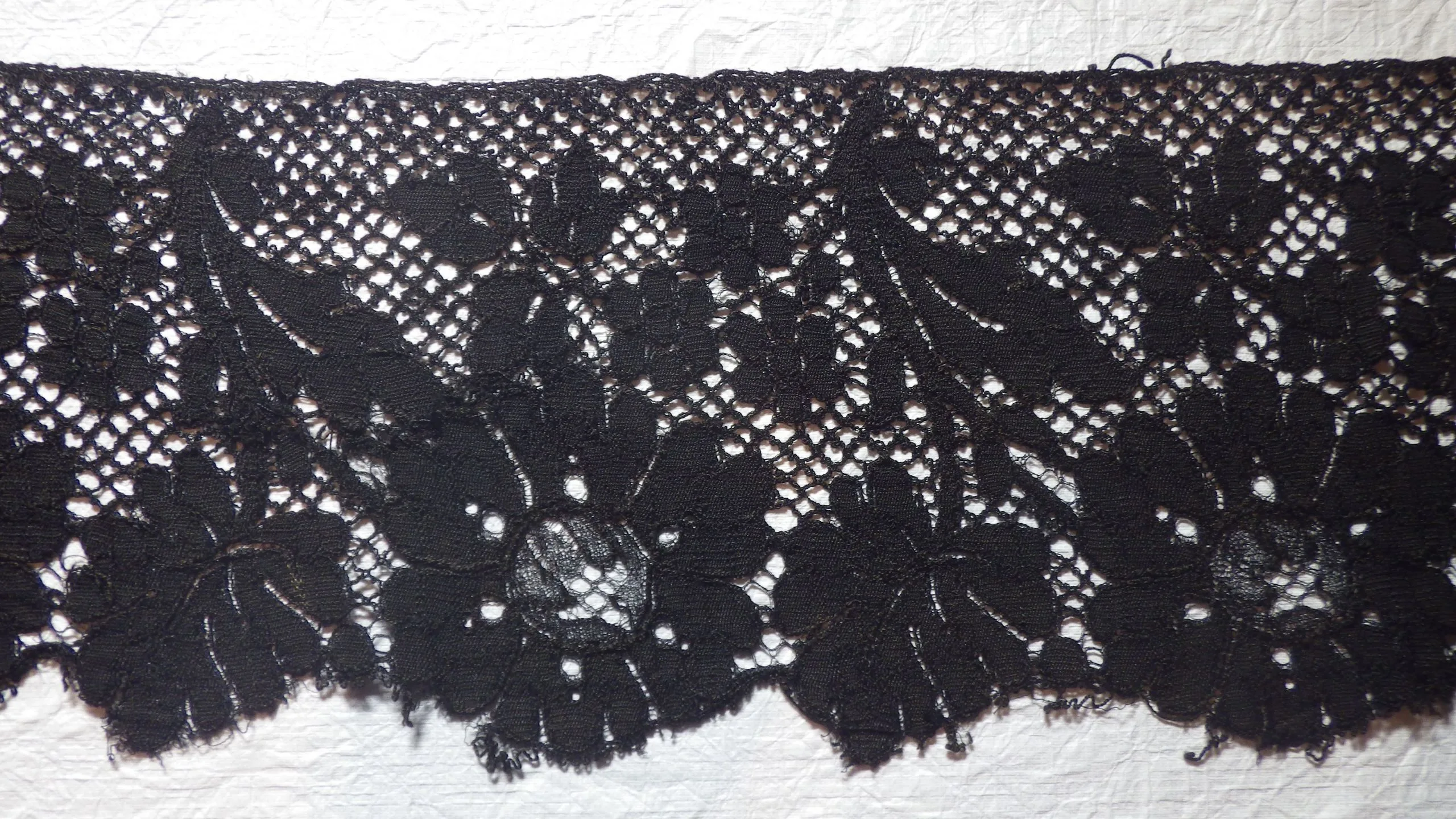 Strip of black lace with a scalloped lower edge and a repeating floral and foliate pattern on a diamond-mesh net ground, laid flat on a white surface
