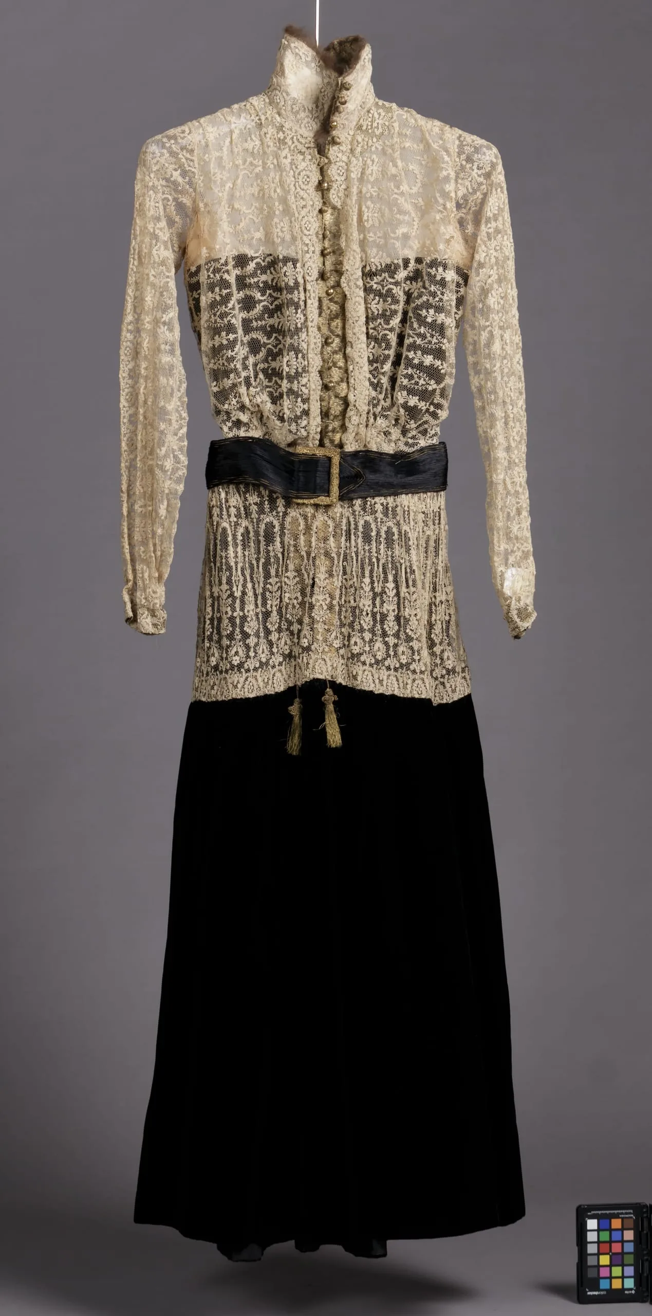 - Bodice: Silk velvet, linen lace, metallic thread ribbon, fur, metallic thread covered buttons. Skirt: Silk velvet, linen lace, silk cording and metallic thread, metallic thread ribbon buckle, metallic thread tassels