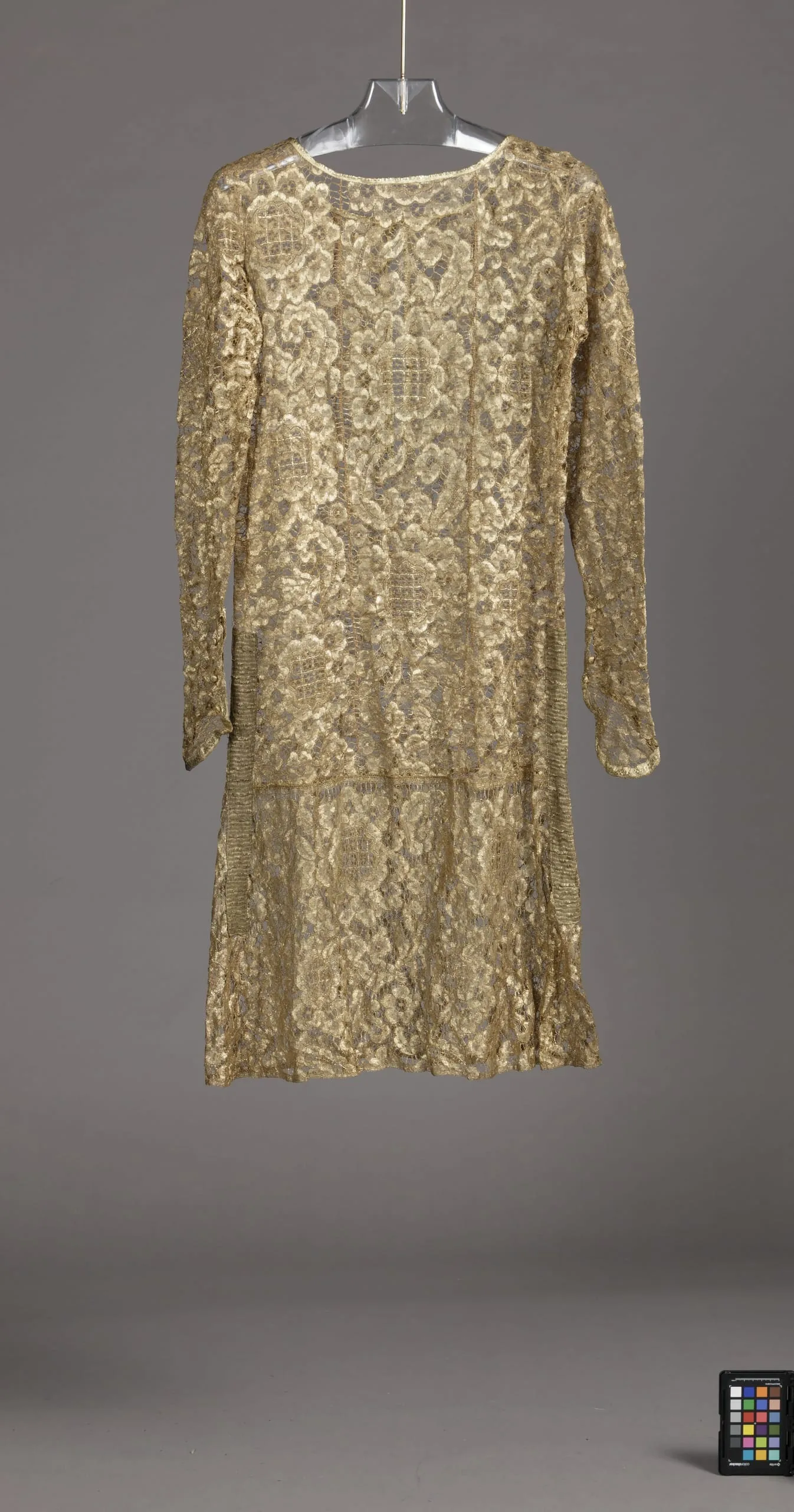 - Dress: linen and metallic-thread lace with metallic-thread passementerie Underdress: silk plain weave (crepe chiffon) and silk plain weave (crepe) with silk and metallic-thread plain weave double cloth with metallic-thread passementerie
