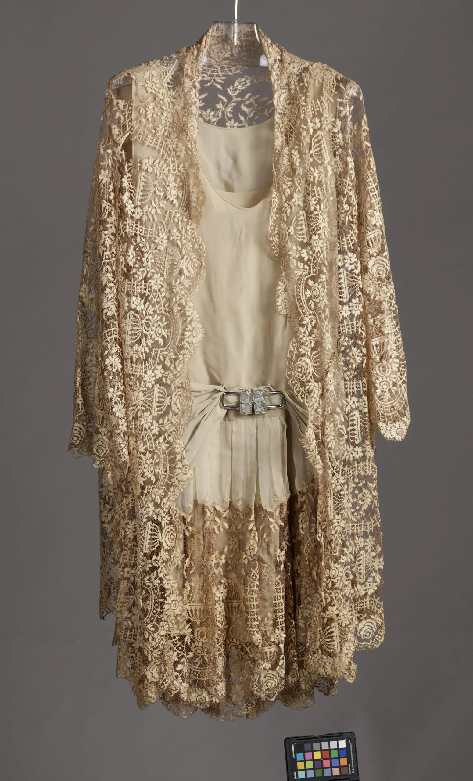 - Dress: Silk plain weave (crepe) with silk lace and metal and glass buckle