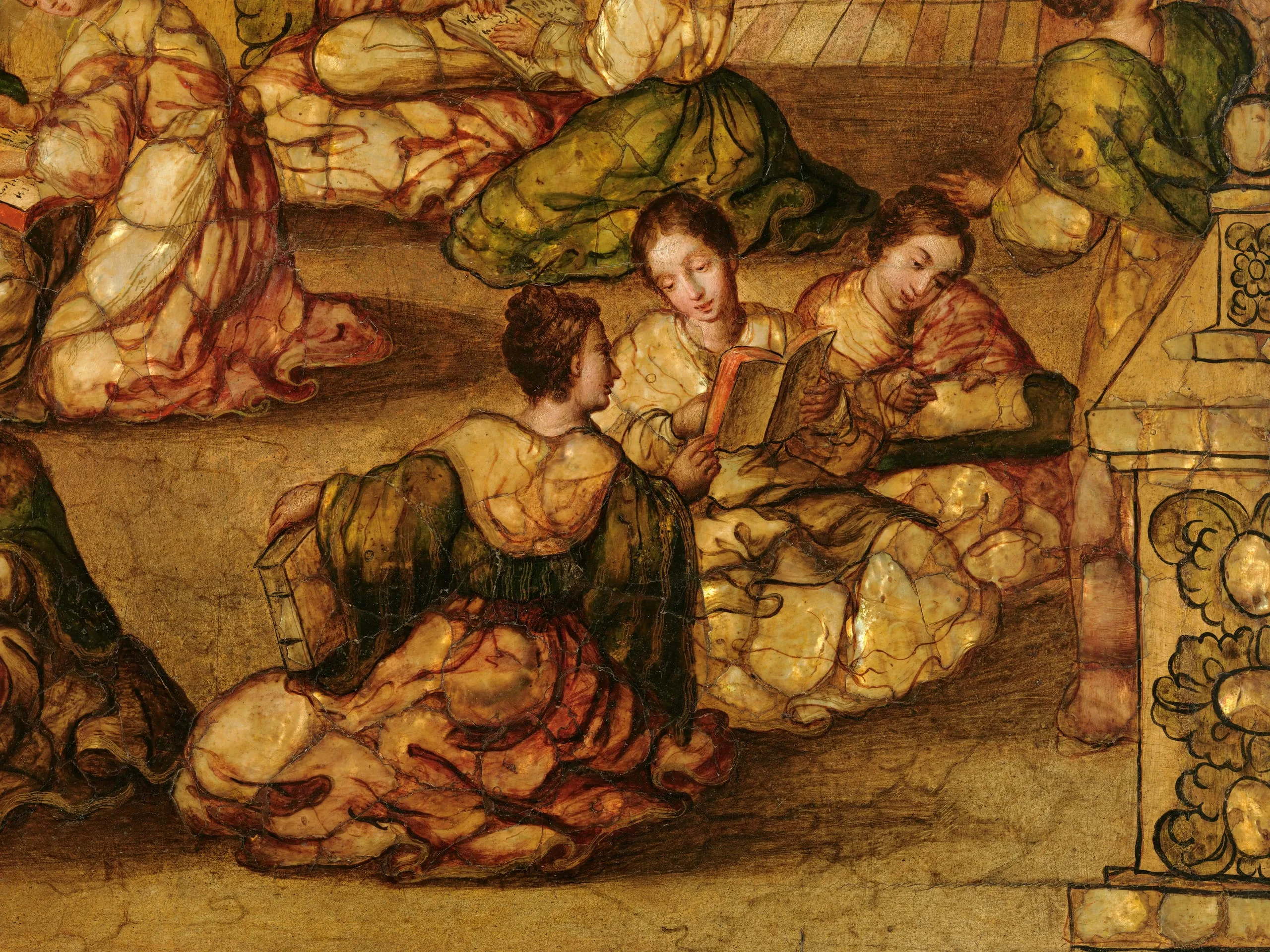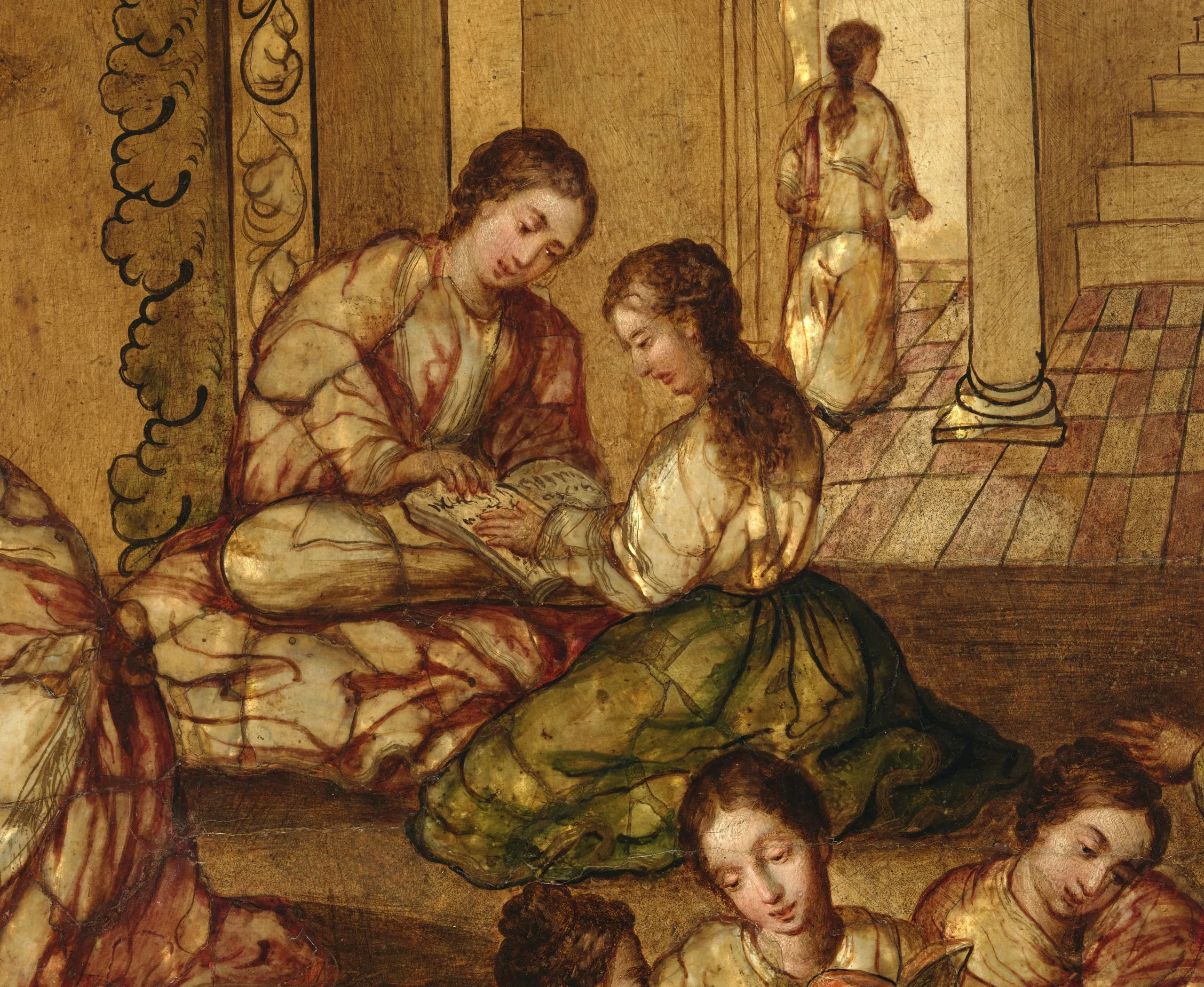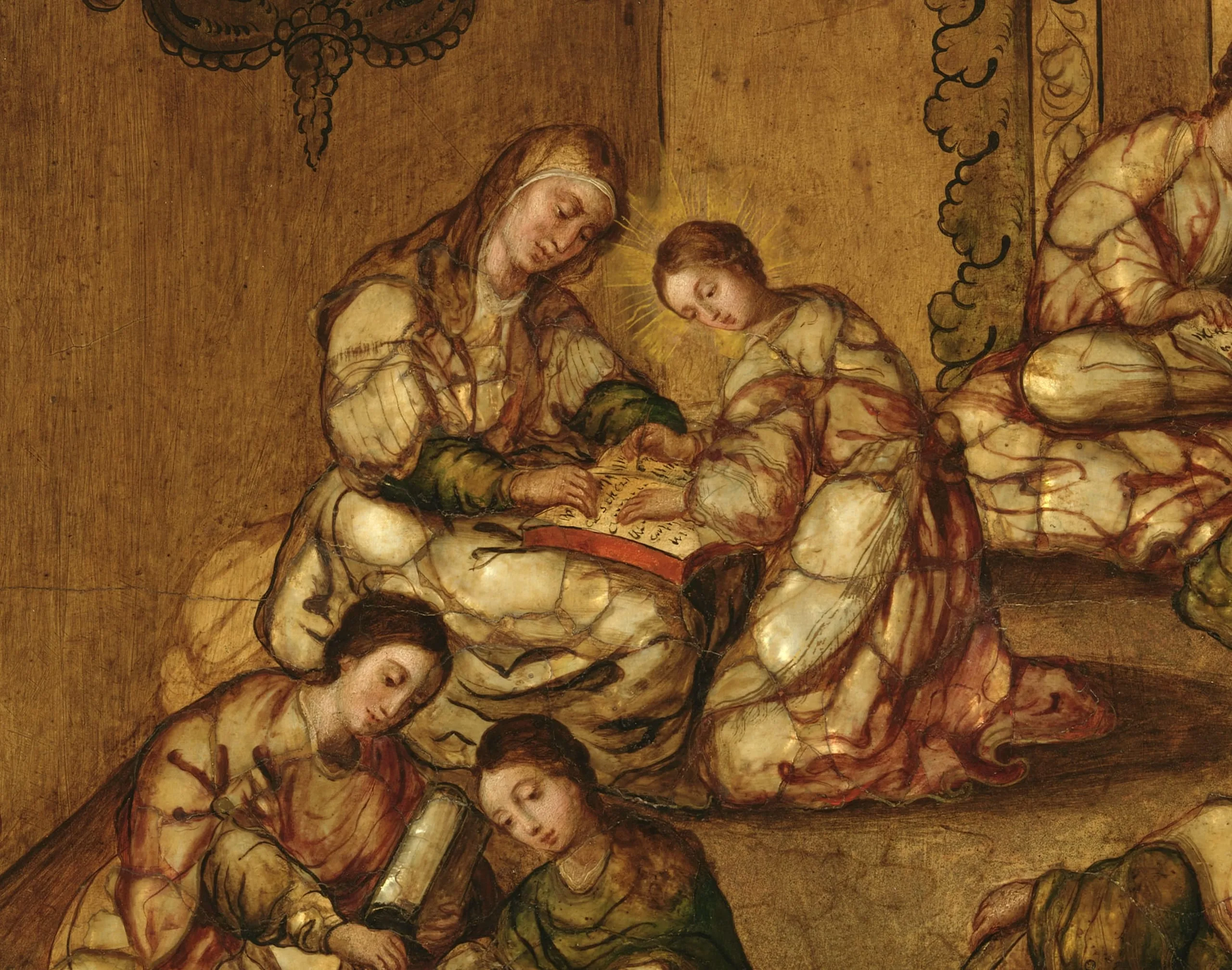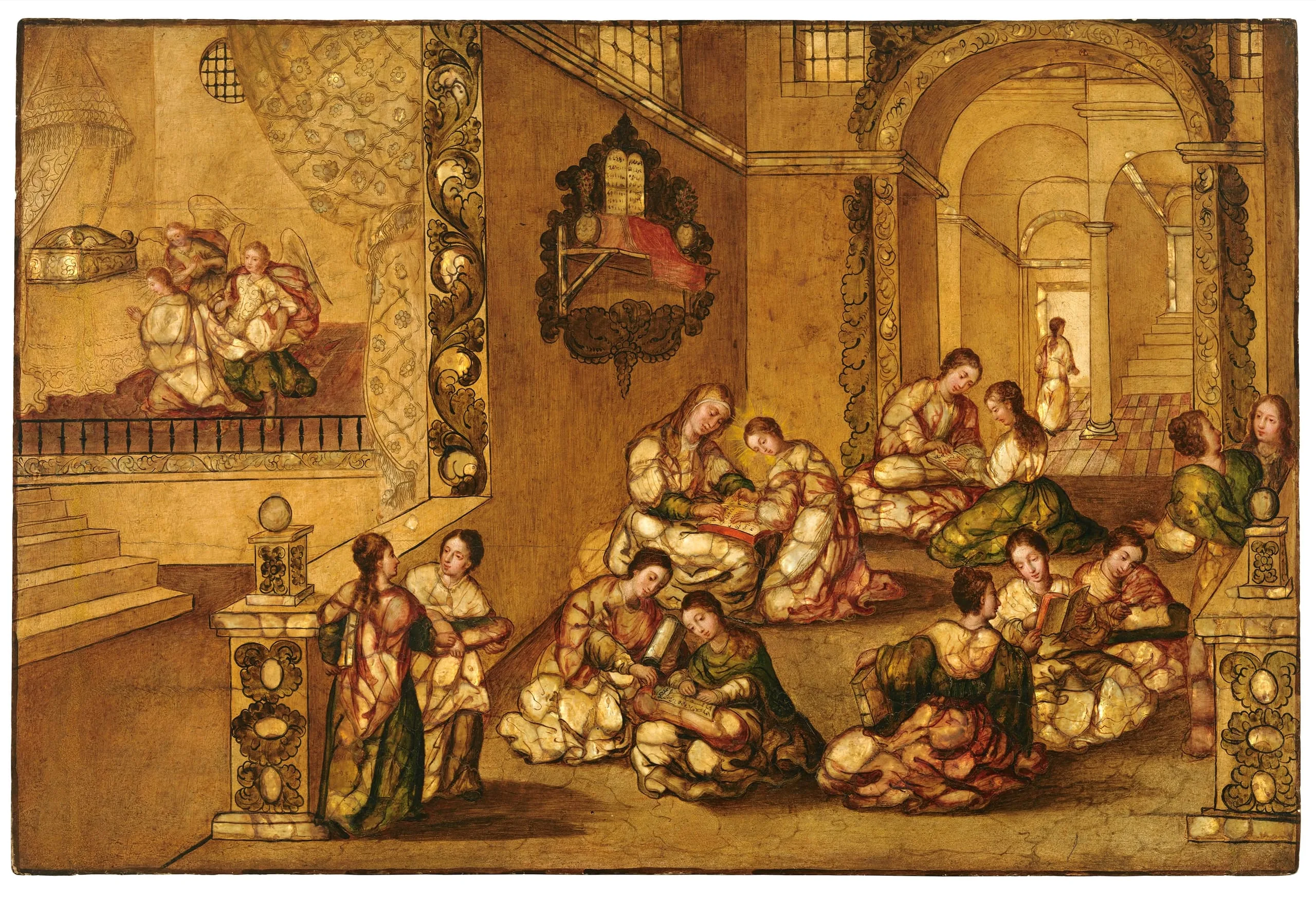 González’s Education of the Virgin was probably part of a larger set devoted to the Life of the Virgin. The subject had no scriptural basis but was described in medieval apocryphal texts and became popularized in German, English, and French books of hours. Visual precedents for the composition are rare, and González seems to have been as much attuned to Flemish prints of the Virgin sewing in the temple as to the recent upsurge in Spain of images of Saint Anne as Mary’s teacher.