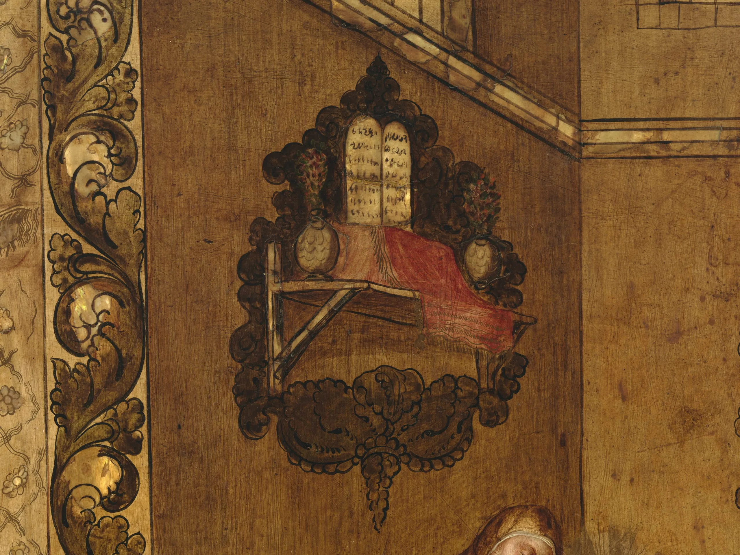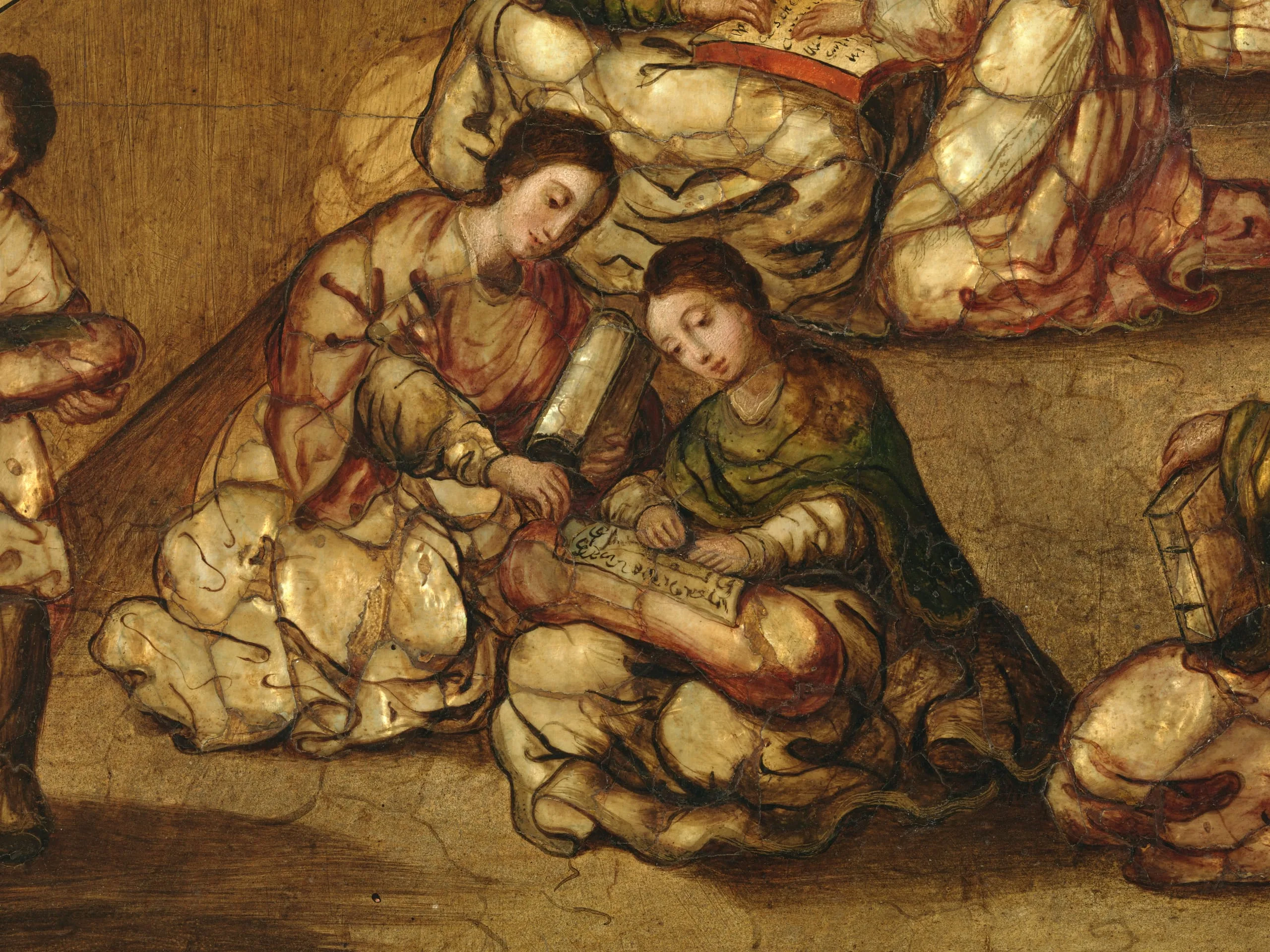 Among the most dazzling paintings invented in New Spain were those inlaid with mother-of-pearl, known as enconchados. Conceived in the traditional manner of Western painting, the works include shell fragments that reference a range of Asian decorative arts, which flowed in through various trade networks. Pearls had also been associated with the legendary riches of the Americas since the conquest. Their materiality connoted imperial power, ostentation, and wealth. The genre reached its apogee from roughly 1680 to 1700, and Miguel González was among its most salient practitioners. Aside from individual devotional pictures, many enconchados were created as multipanel series portraying the lives of the Virgin, Christ, and various saints—the iridescent nacre helping to suffuse the works with a sense of the divine. With their mixed technique, the opalescent enconchados stood at the juncture of imperial vision, global trade, religious fervor, and colonial invention.