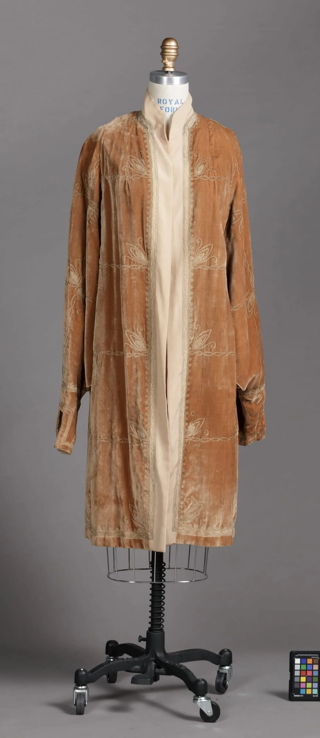 - Silk velvet, silk plain weave (crepe), silk and metallic thread embroidery