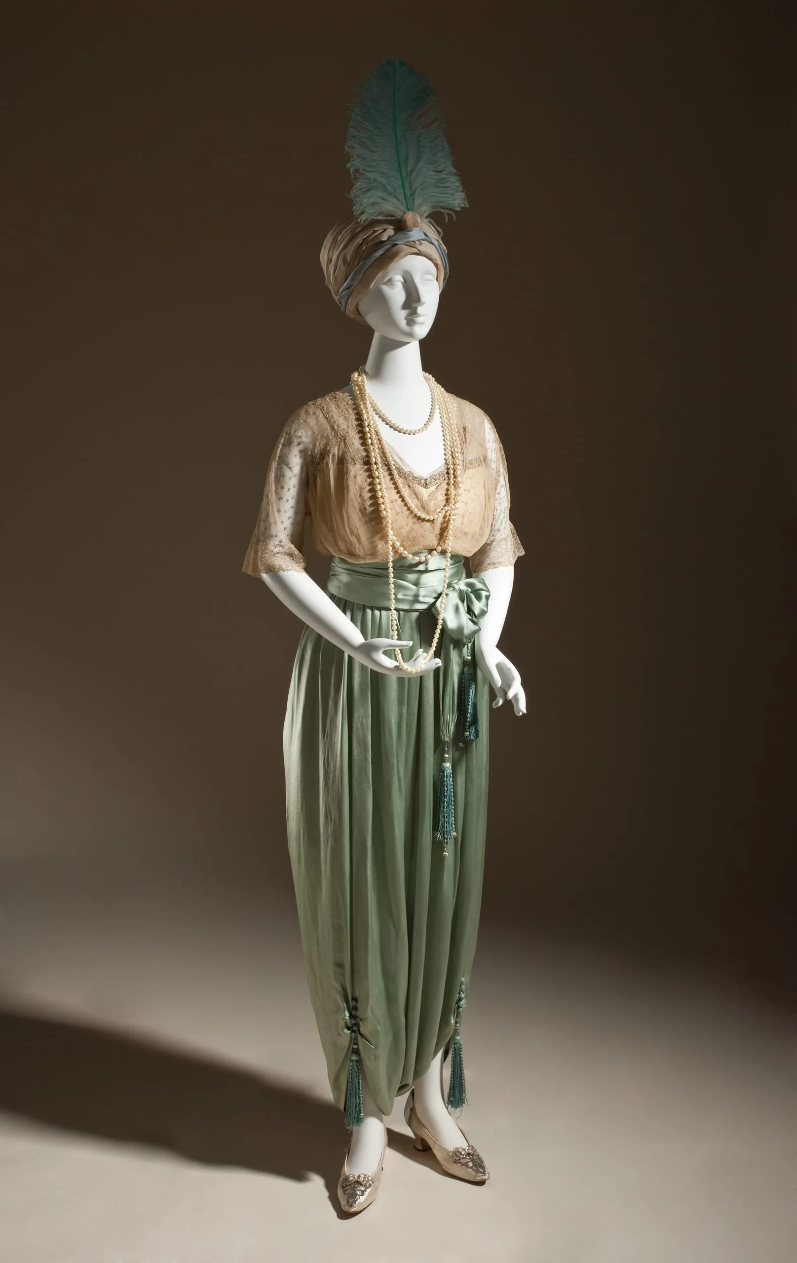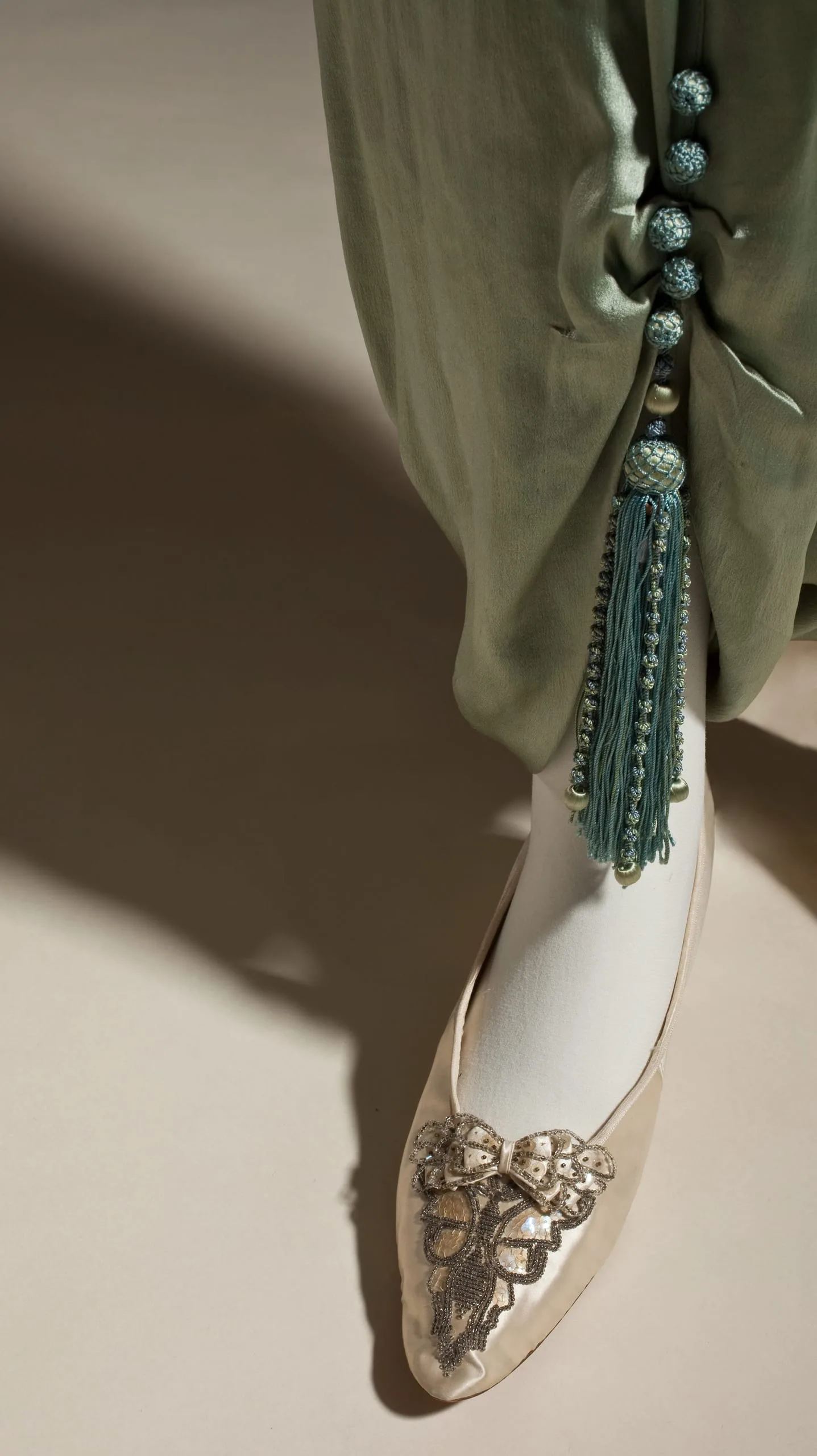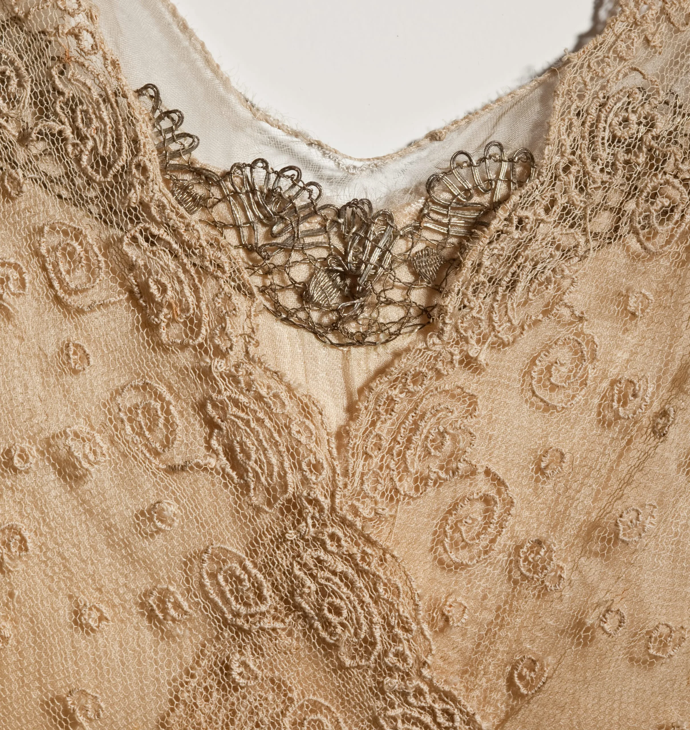 - Silk net (tulle) and silk satin (charmeuse) with metallic-thread passementerie and silk tassels