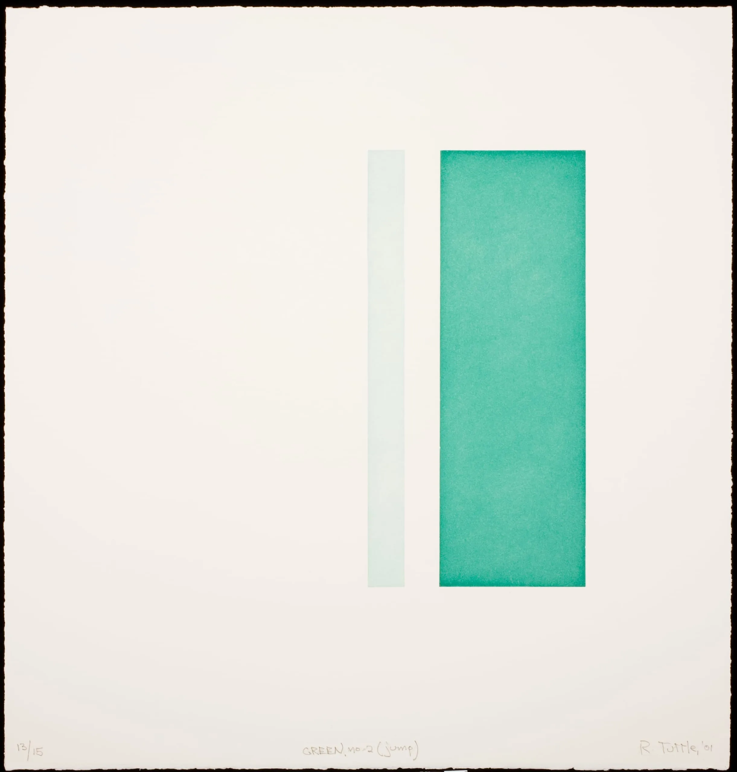 Abstract print with two vertical rectangles: a narrow pale blue-green beside a wider teal rectangle, centered on white paper with deckled edges