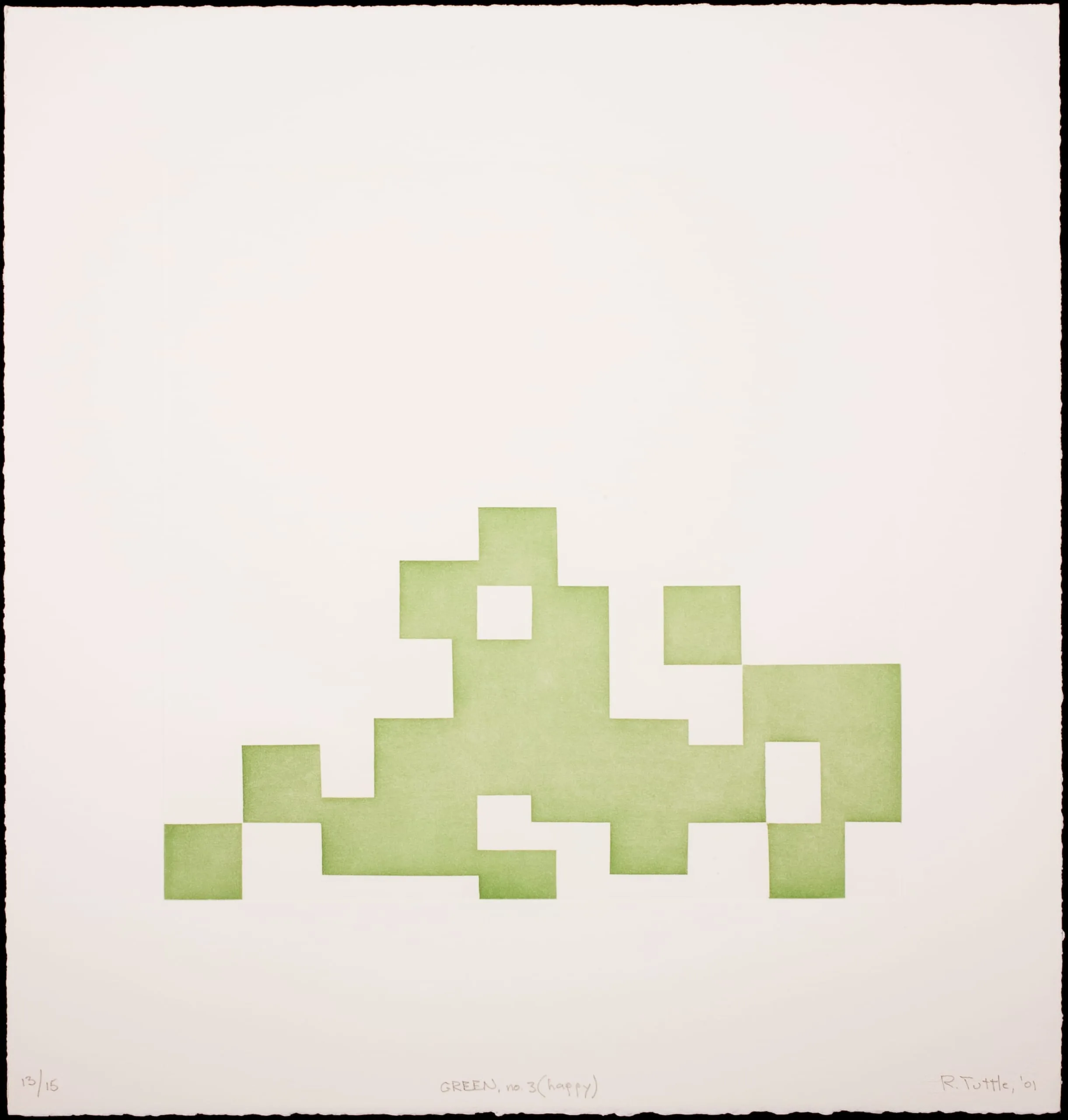 Print on white deckled paper with a stepped cluster of soft sage-green squares forming a loose pyramid shape, with white gaps between shapes; pencil title and signature below