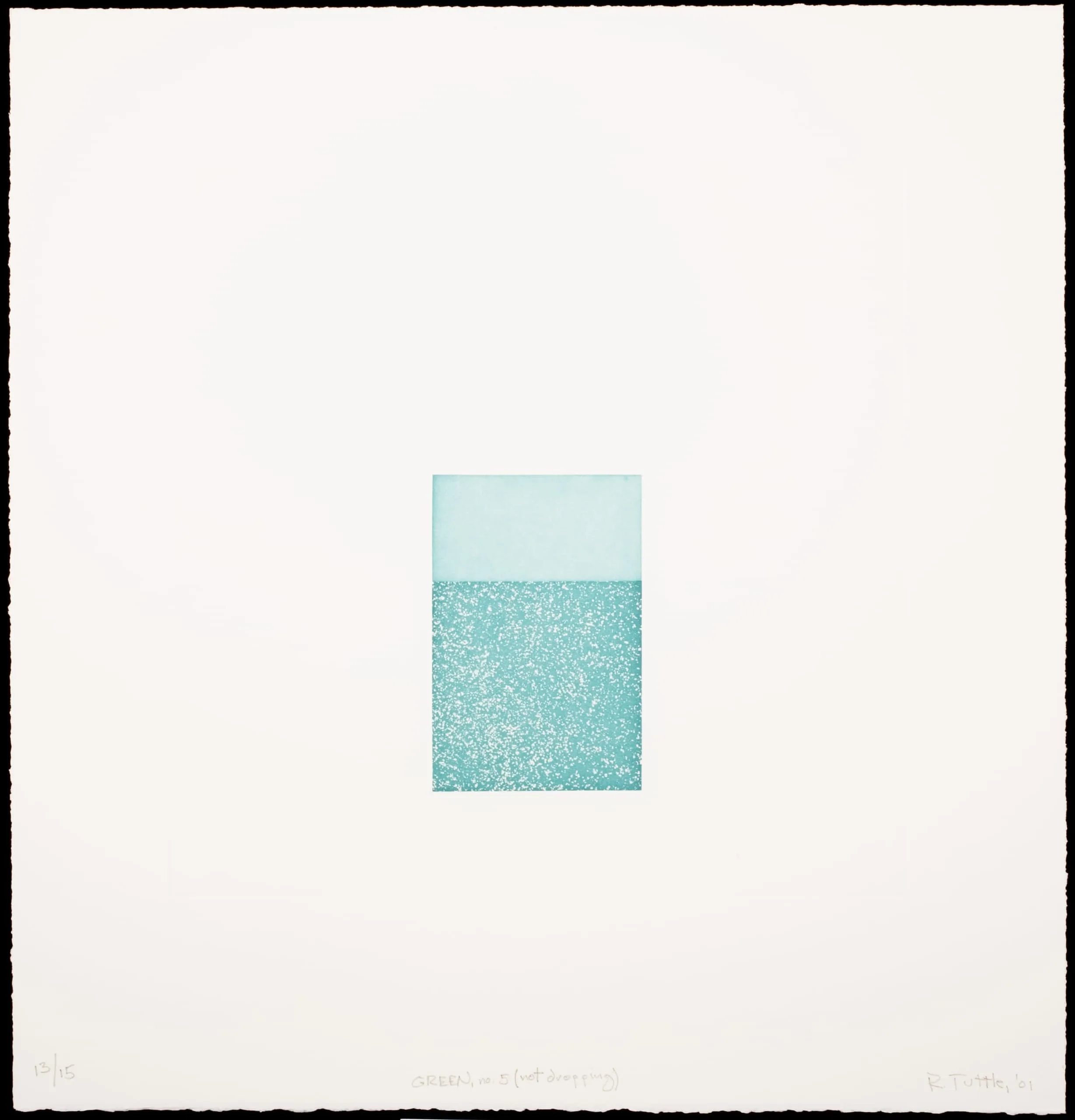Print on white deckled paper with a small centered rectangle divided into a smooth pale aqua upper half and a speckled teal lower half; pencil inscription and edition number below
