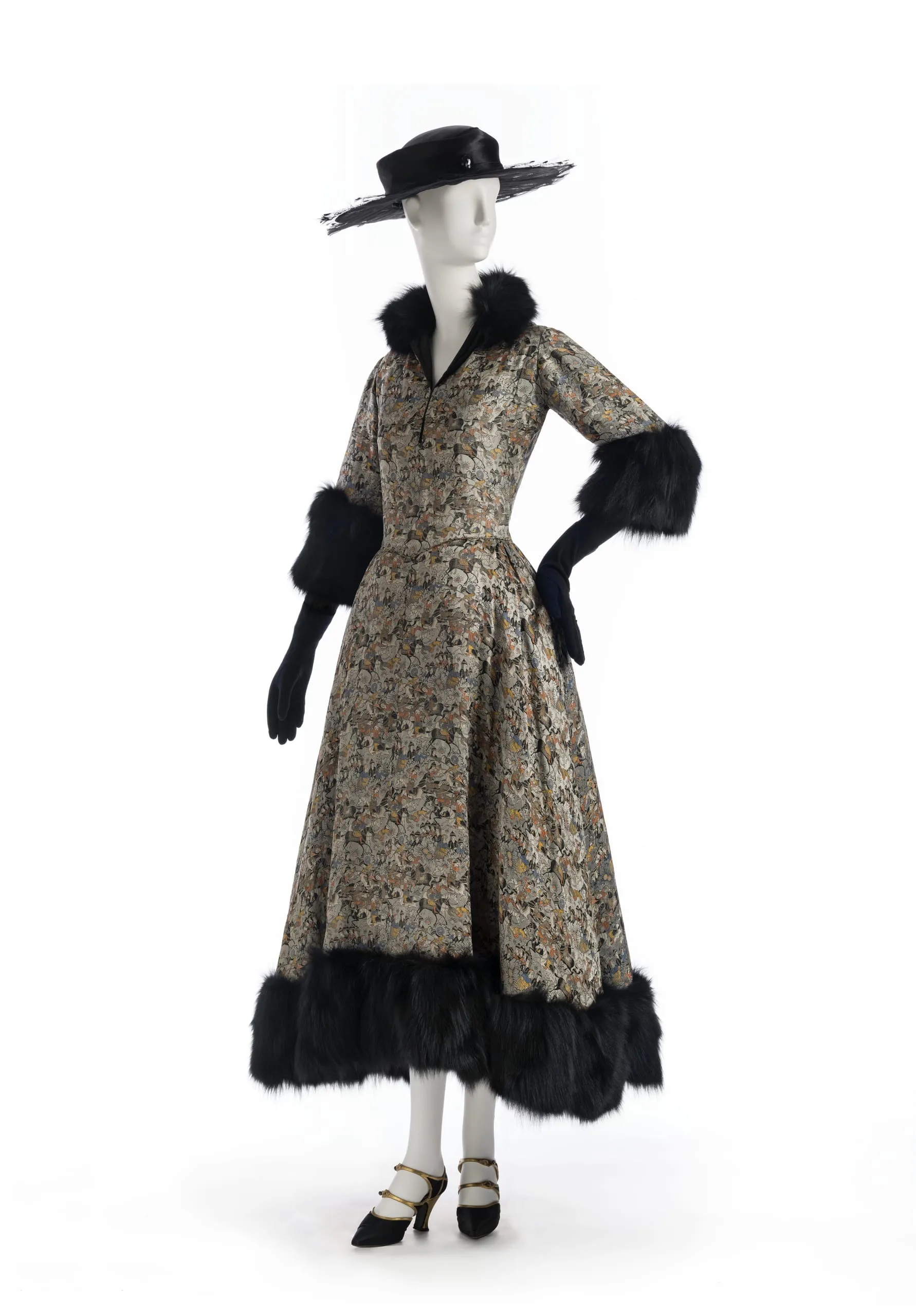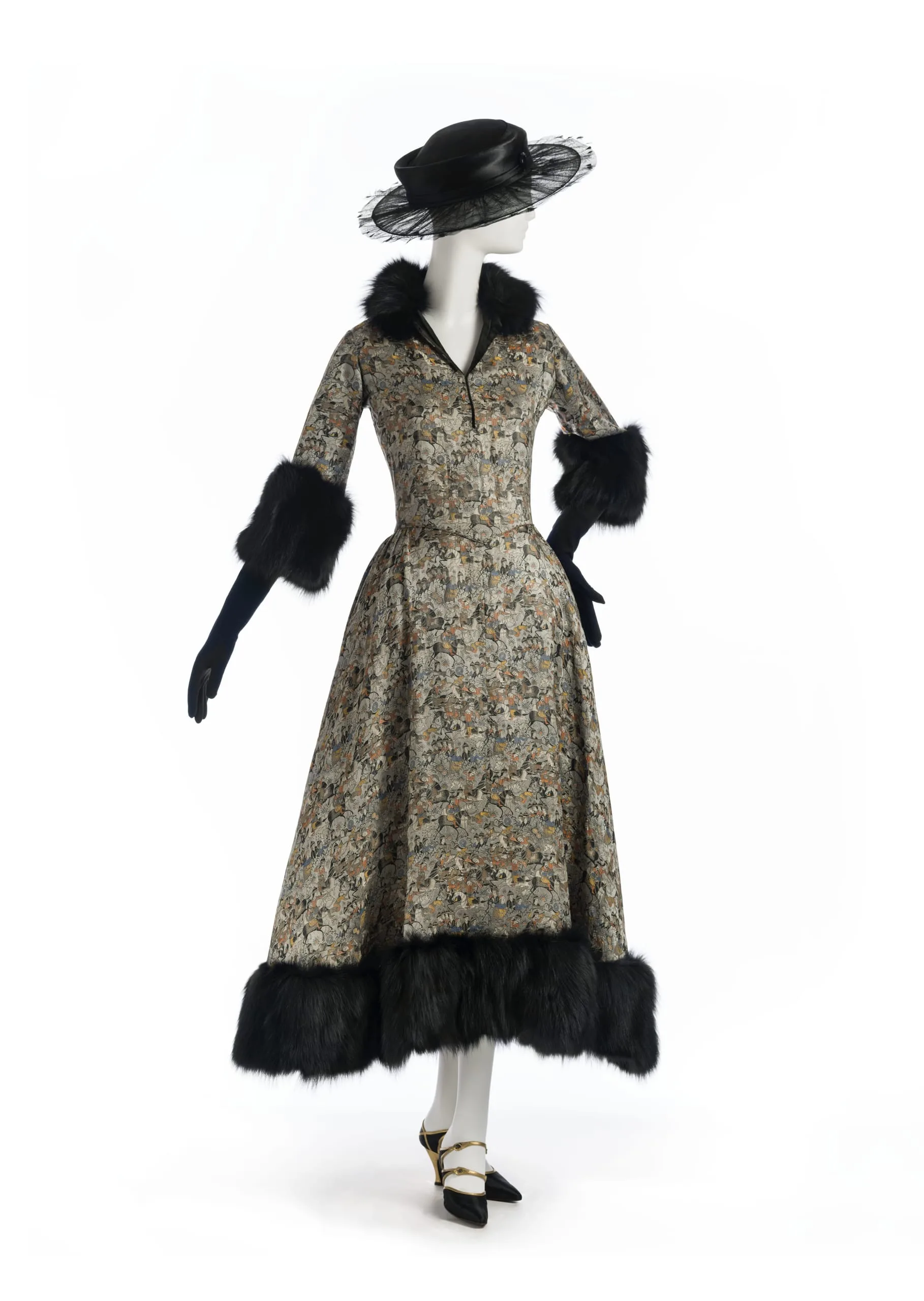 - Silk satin with silk and metallic-thread supplementary-weft patterning, with fox fur and silk velvet trim