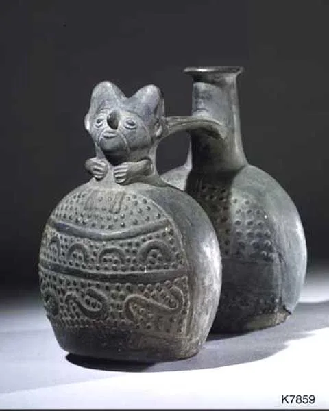 Double-bodied bridge-and-spout vessel with human figure