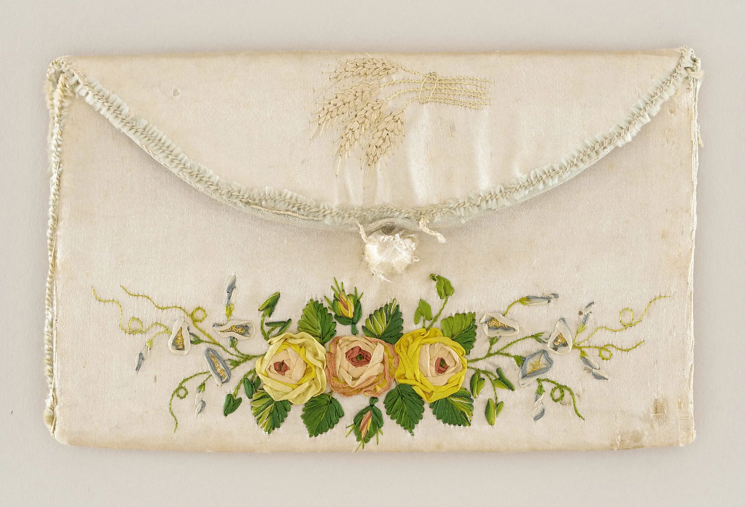 - Silk satin with silk embroidery, silk plain weave ribbon embroidery, and glass beads
