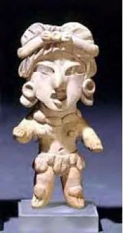 Small cream and tan ceramic standing figure with an elaborate headdress, raised arms, wide face, and circular ear ornaments, displayed against a teal background
