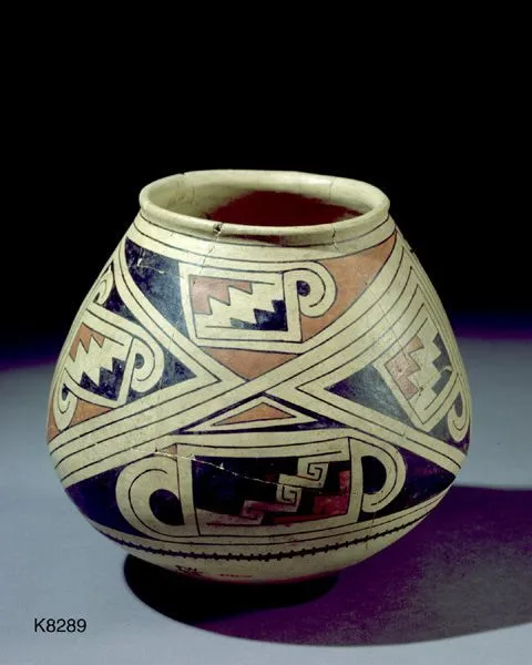 - Polychrome, Red and Black on White Vessel with Geometric Motifs