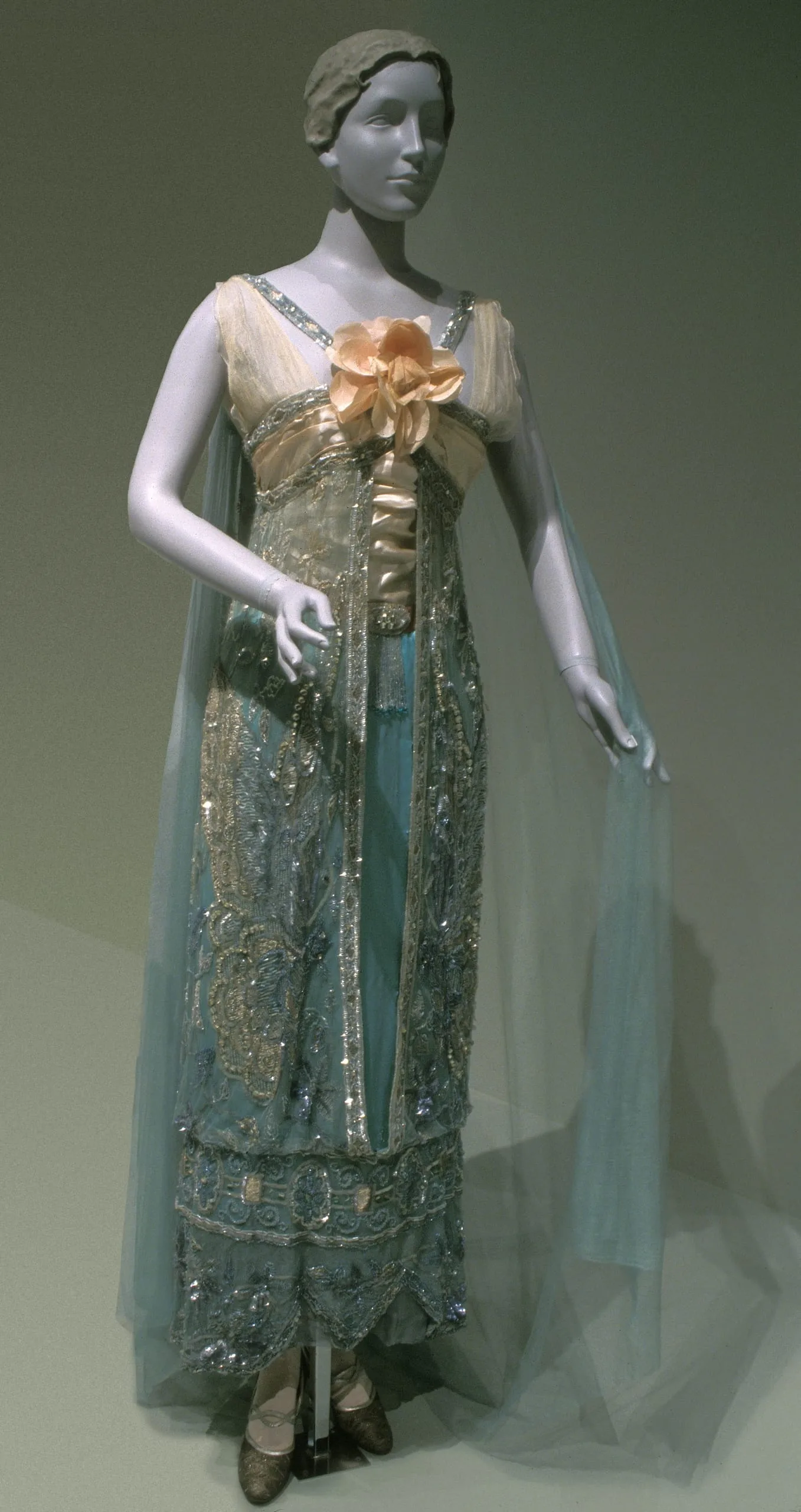 - Silk net and silk satin, with glass beads, plastic sequins, crystals, and silk embroidery