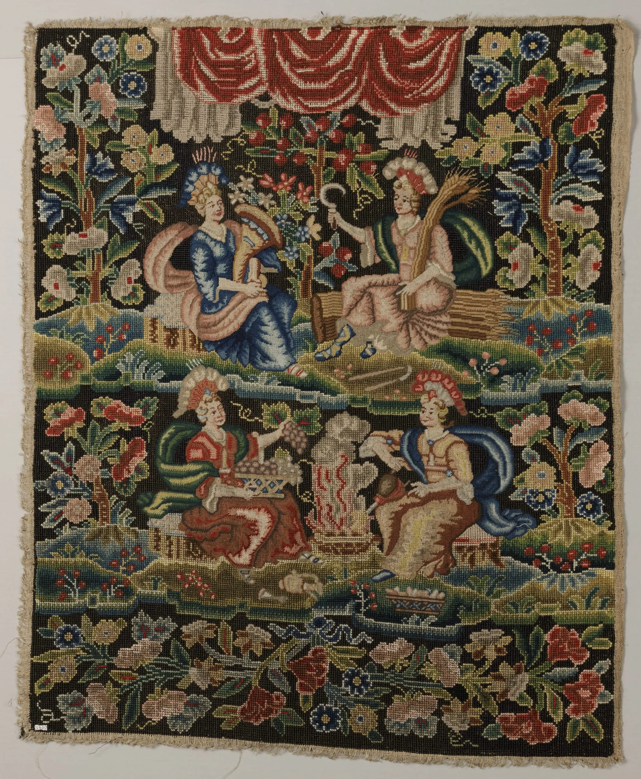 Vertical needlework panel in tent stitch, four elegantly dressed figures in a garden with flowering borders on a black ground