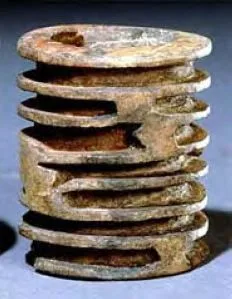Jade or stone cylindrical object with stacked horizontal disc-like rings separated by narrow gaps, mottled green and rust-brown surface with worn edges