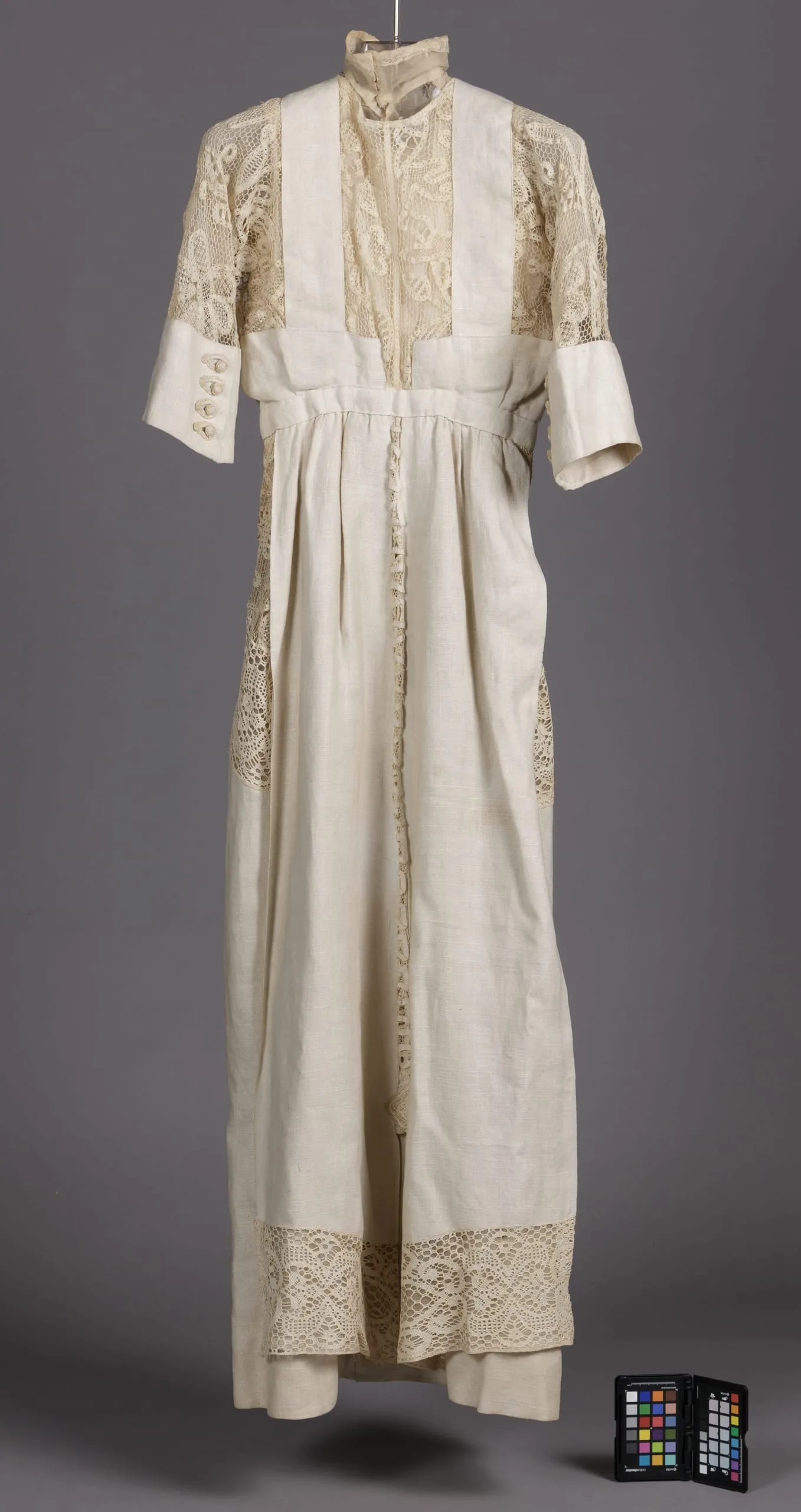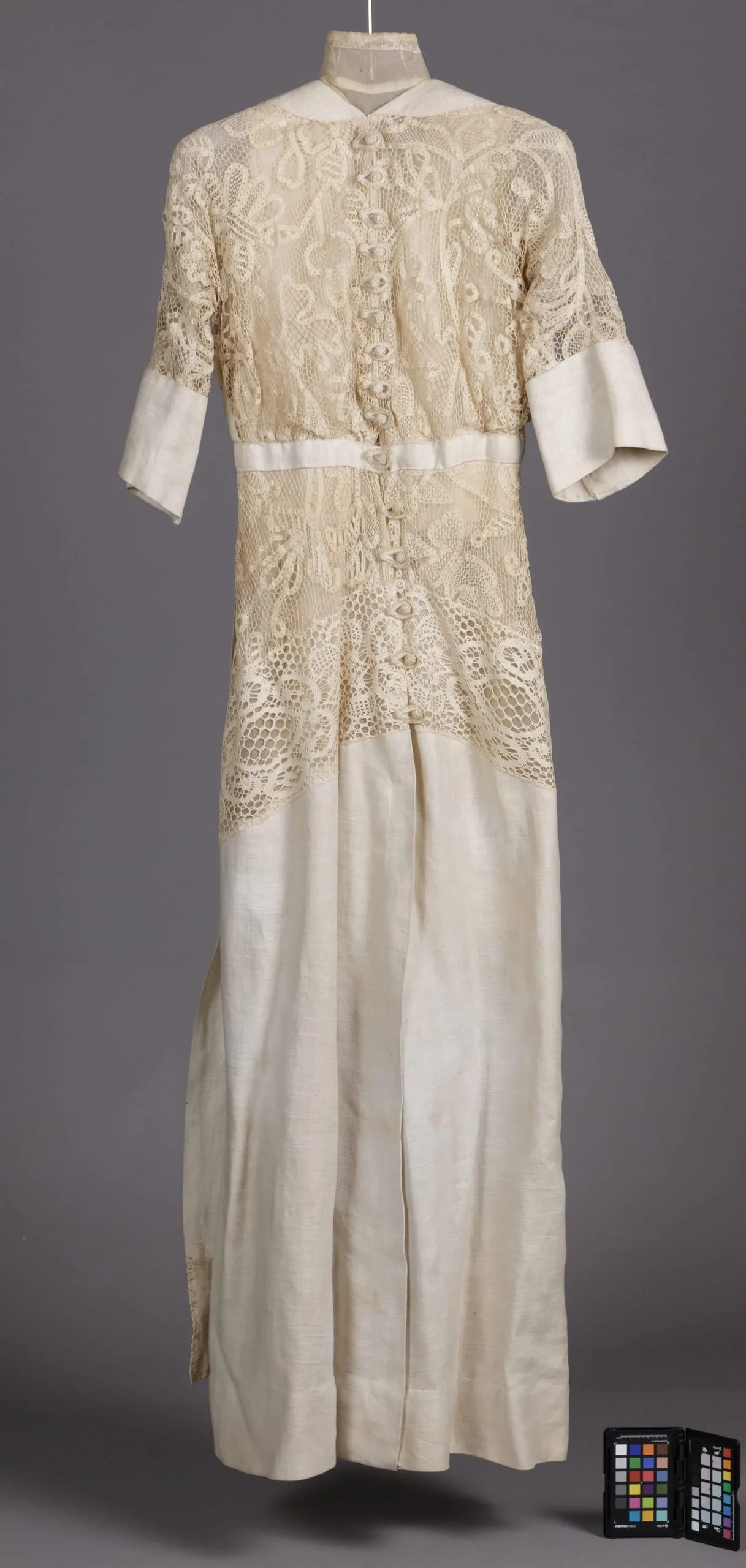 - Linen plain weave and linen lace with silk net and silk plain weave (crepe chiffon)