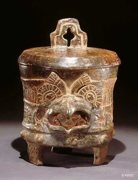 - Lidded Tripod Cylinder Vessel with Human Face in Raptor's Beak