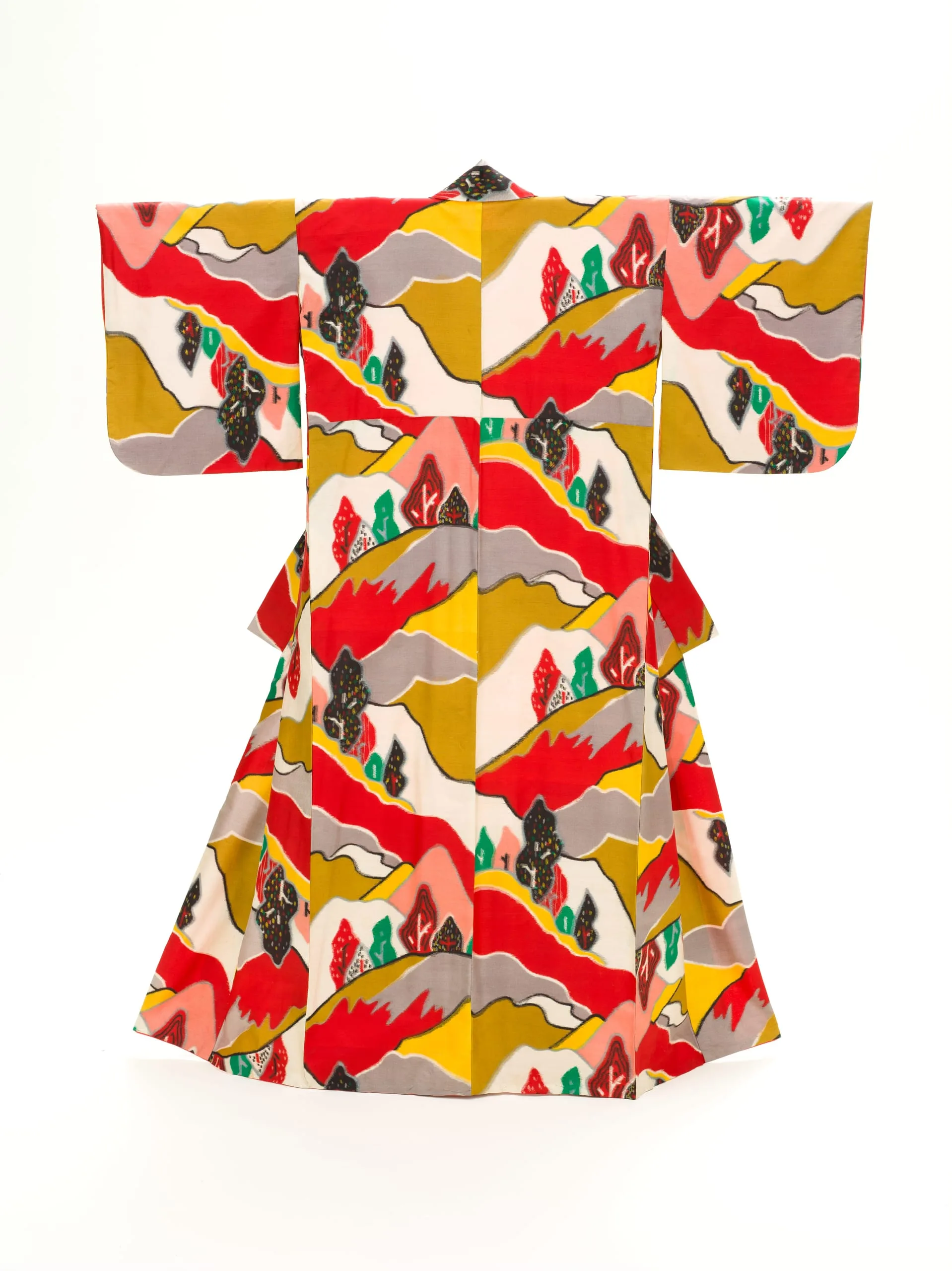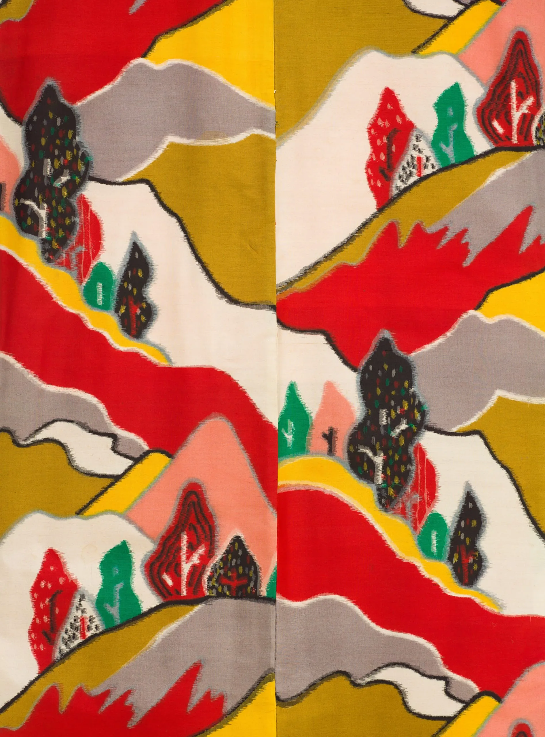 - Silk plain weave with stencil-printed warp and weft ikat (heiyō kasuri meisen)