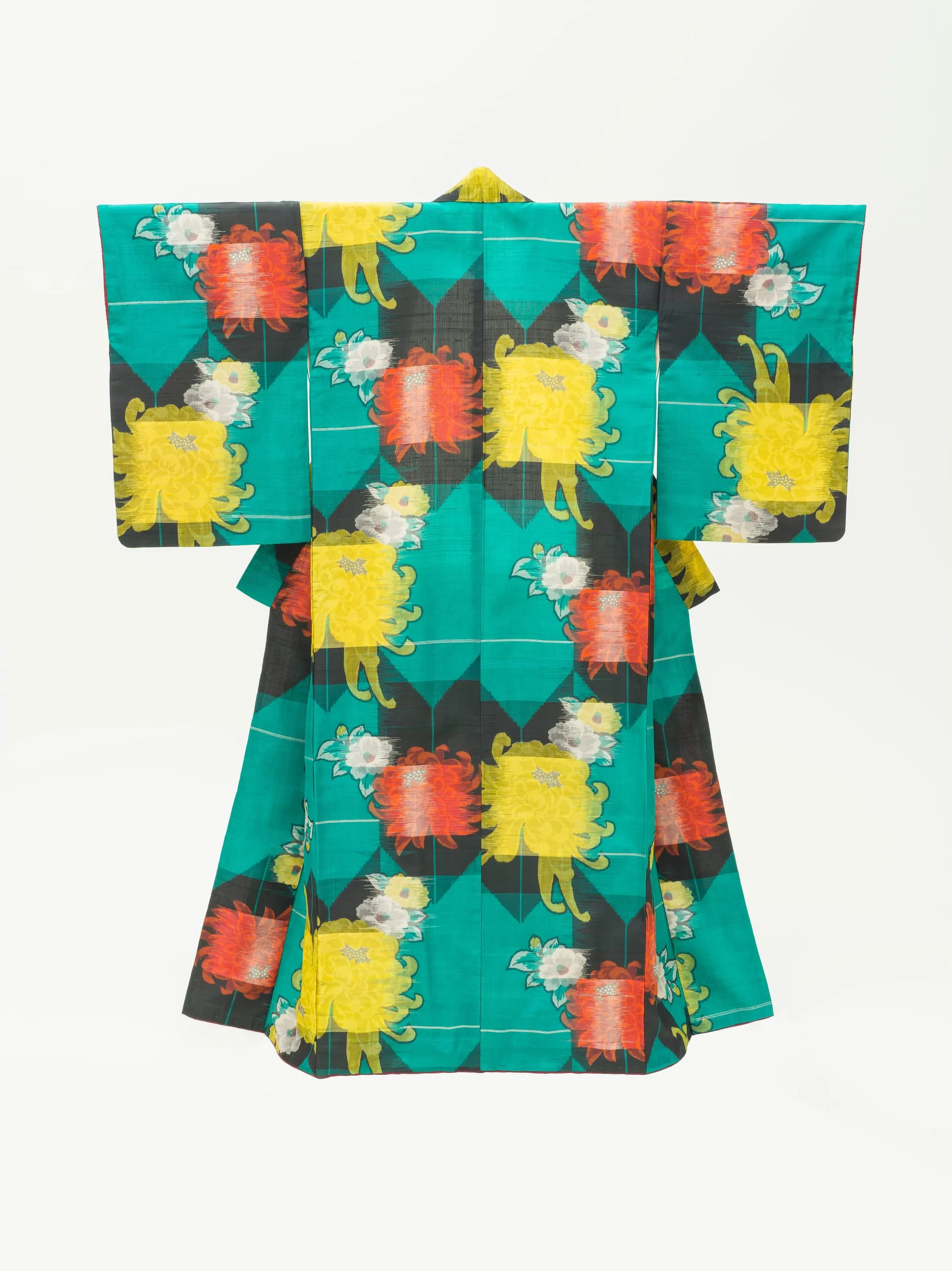 - Woman’s Kimono with Chrysanthemums, Camellias, and Abstract Arrow-Feather Pattern