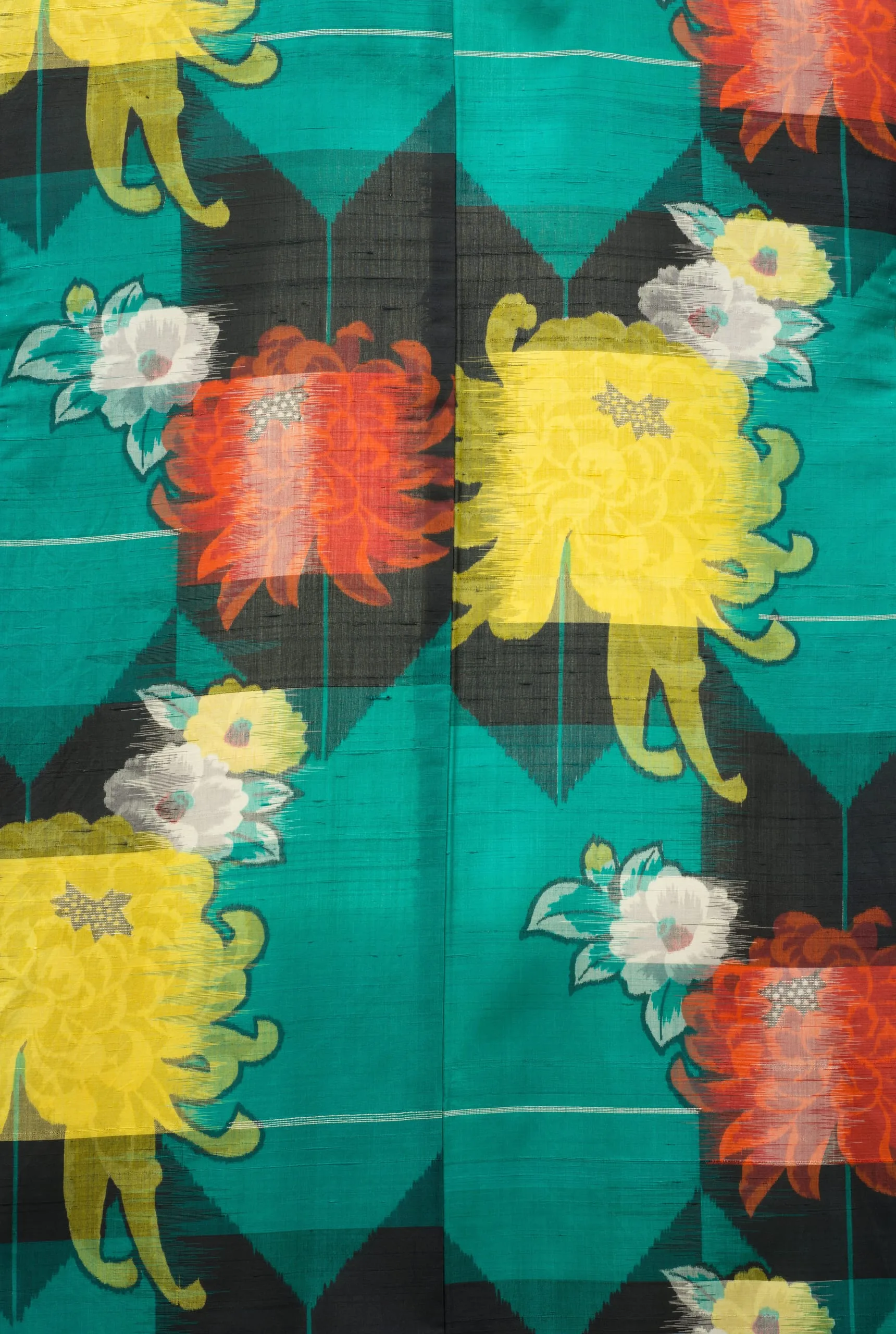 - Silk plain weave with stencil-printed warp (meisen) and tie-resist-dyed weft (yoko-gasuri), gilt-paper-wrapped-silk supplementary weft