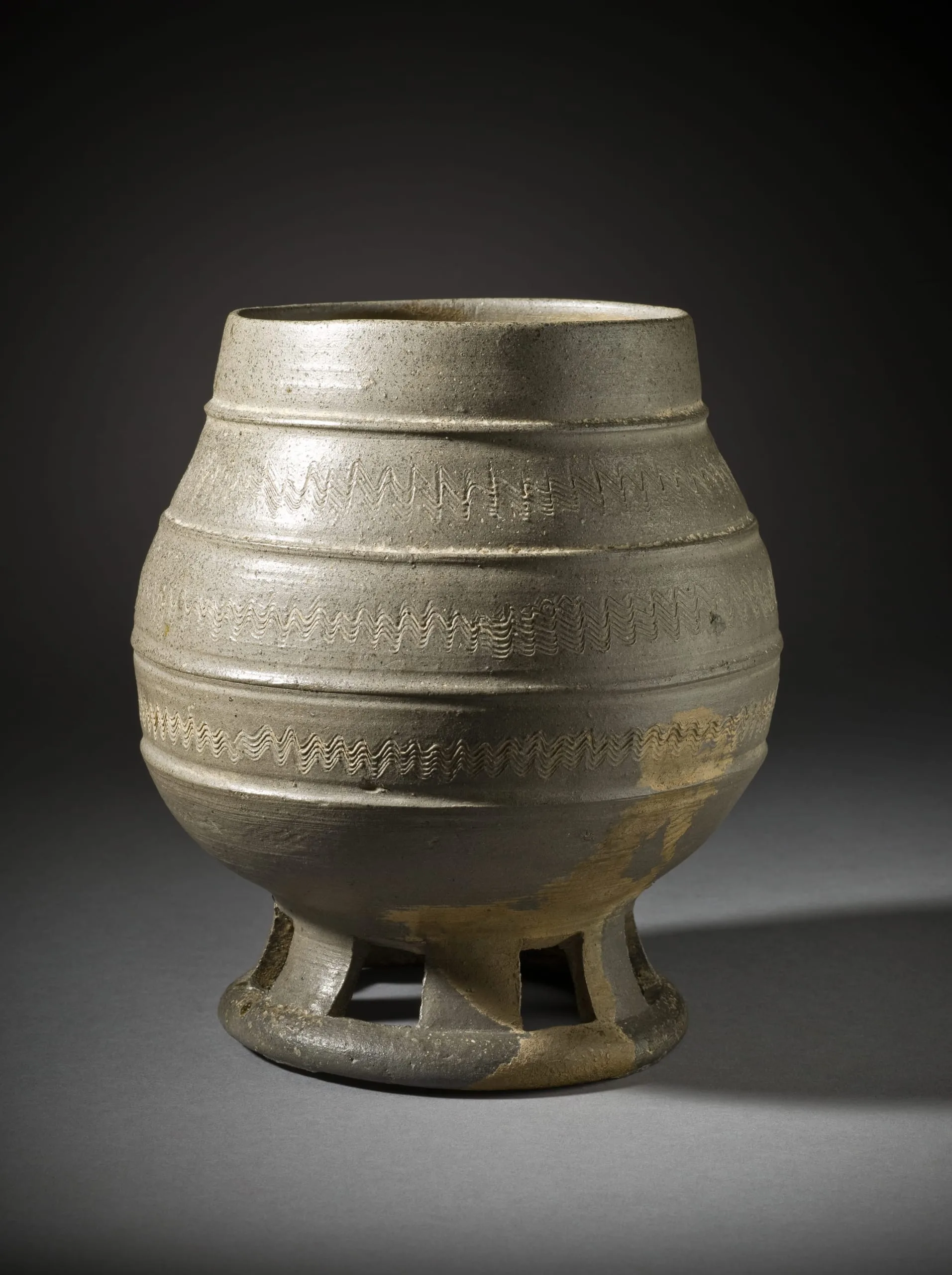 - Coil-built and wheel-thrown stoneware with impressed, combed, and cut decoration and ash glaze