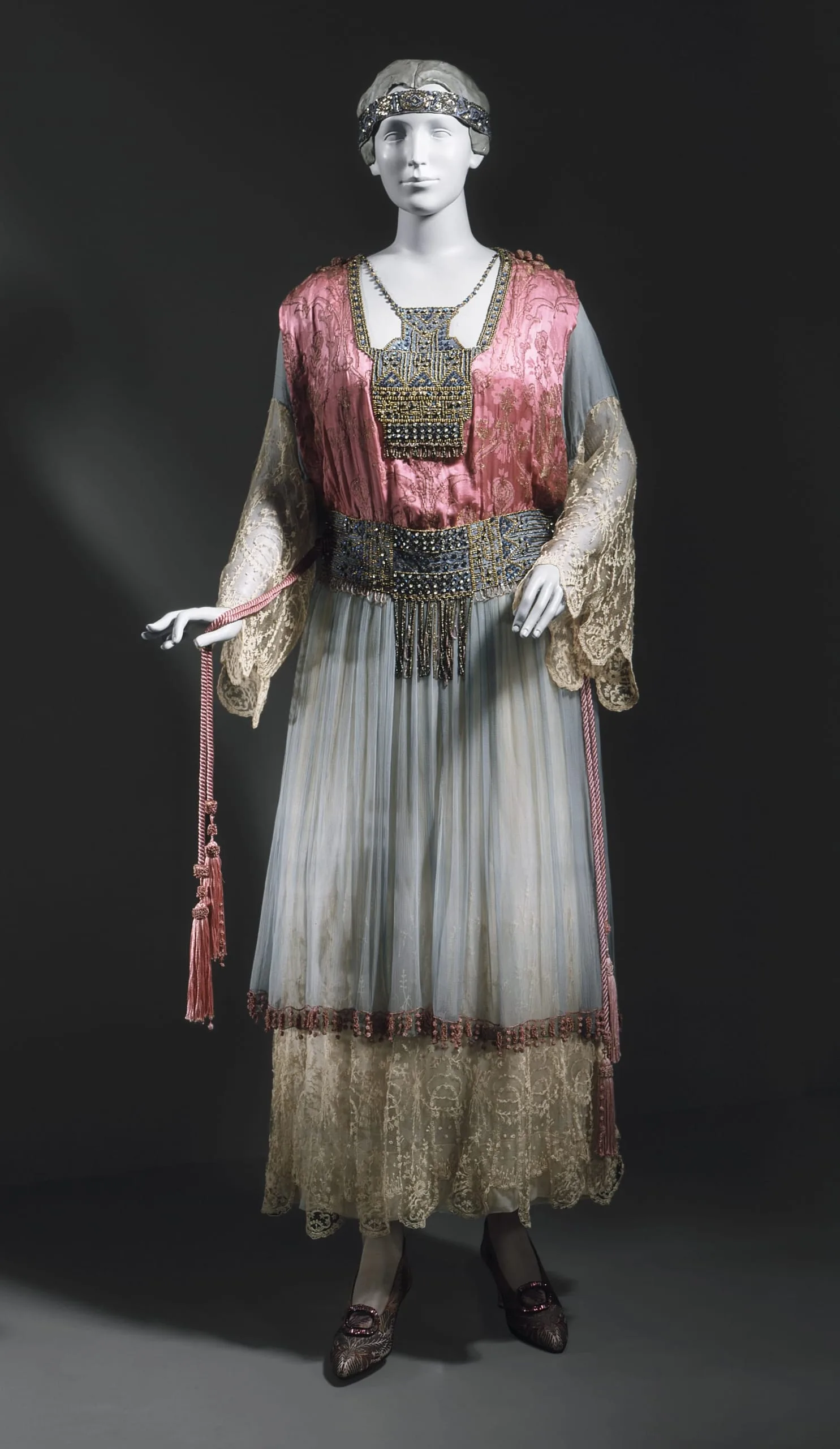 a) Dress: Silk plain weave (crepe chiffon), with silk and linen lace, silk plain weave, and silk and metallic-thread knotted fringe