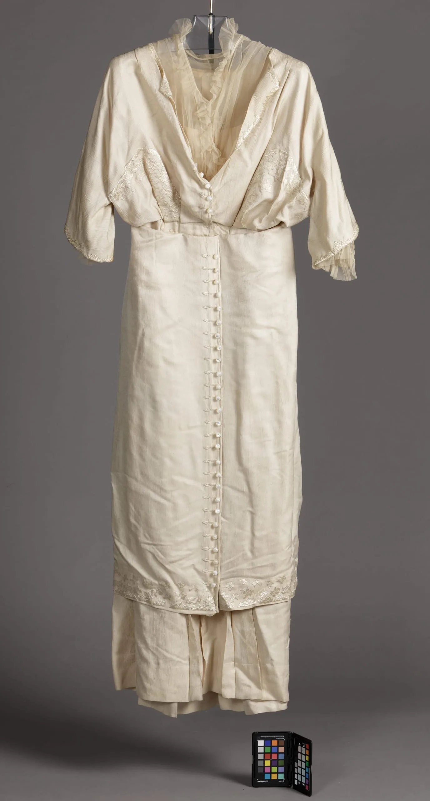 - Silk plain weave with weft-float pattern with silk embroidery, silk net, and glass butttons