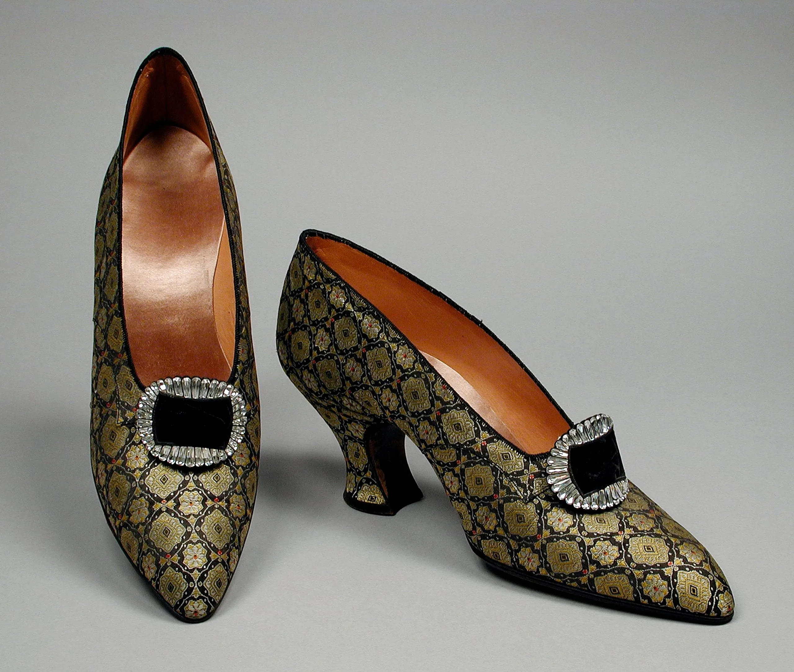 - Silk twill with silk supplementary weft patterning, with paste stone, silk velvet ribbon, and leather