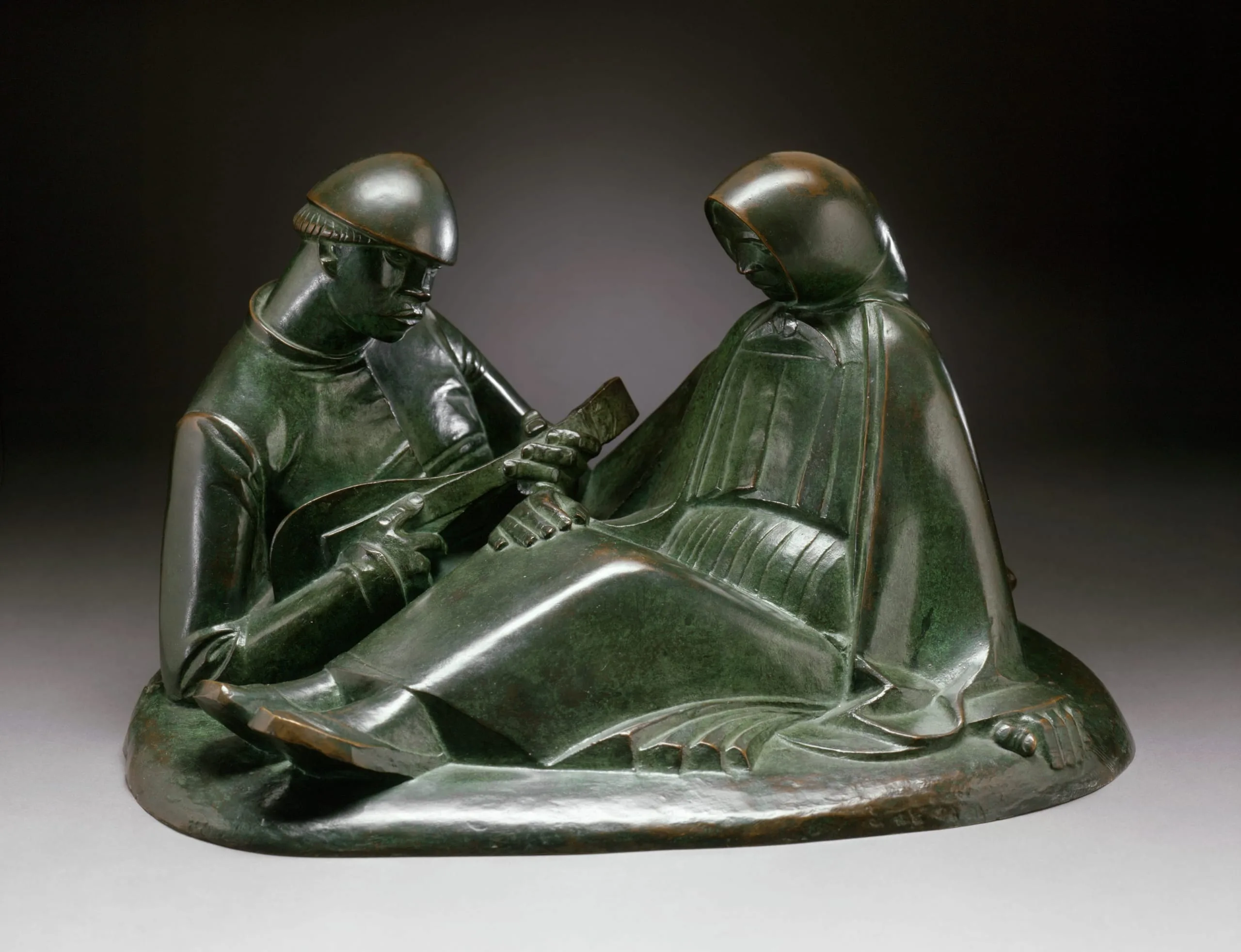 In 1906, Ernst Barlach traveled from Germany to Russia, during which his observations of laborers working in the fields had an immediate impact on his beginnings as a sculptor. Russian Lovers, inspired by this trip, exists in bronze and also in white porcelain, which suggests the vast Russian winter landscapes.