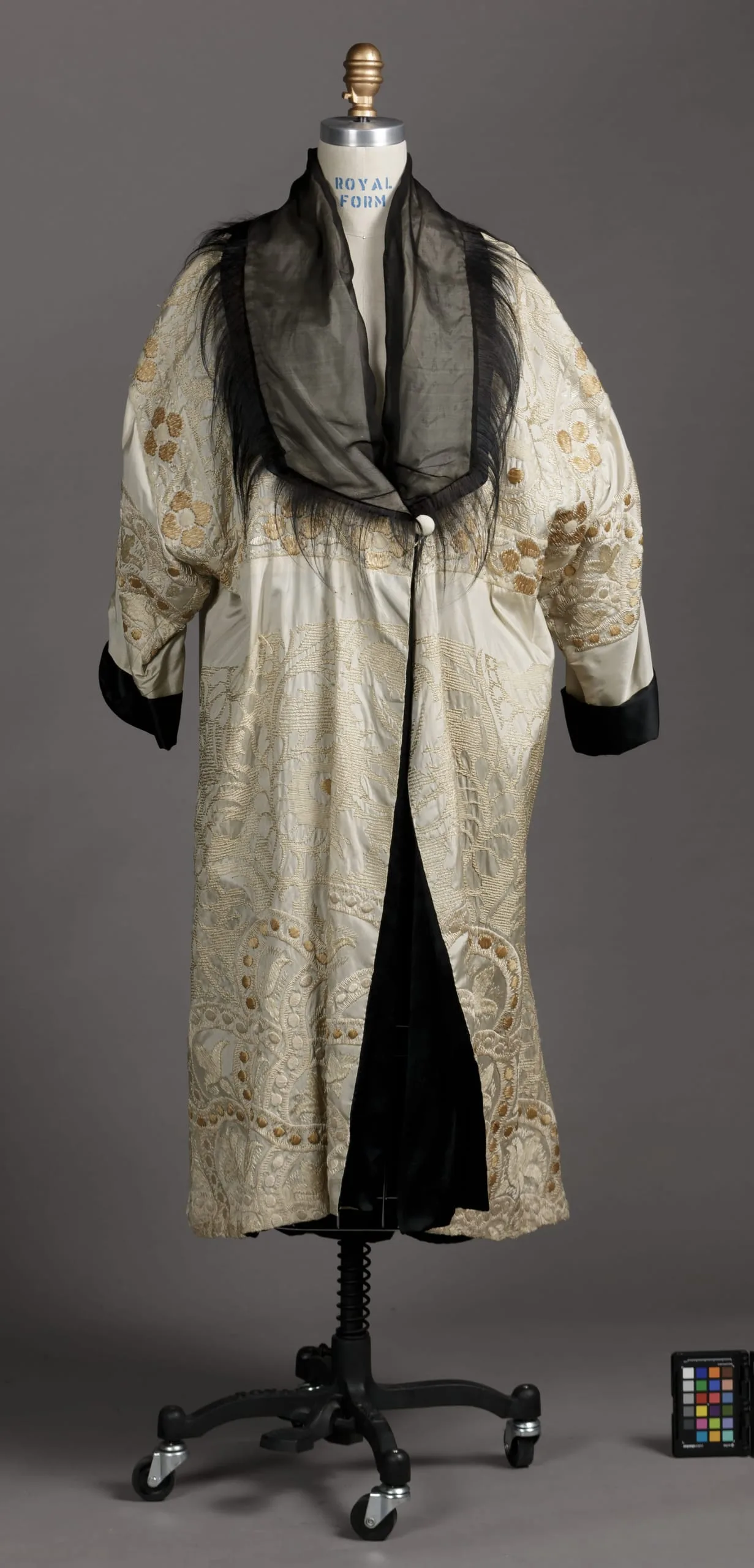 - Silk plain weave (taffeta), silk satin, and silk plain weave (chiffon), with silk and wool embroidery and monkey fur