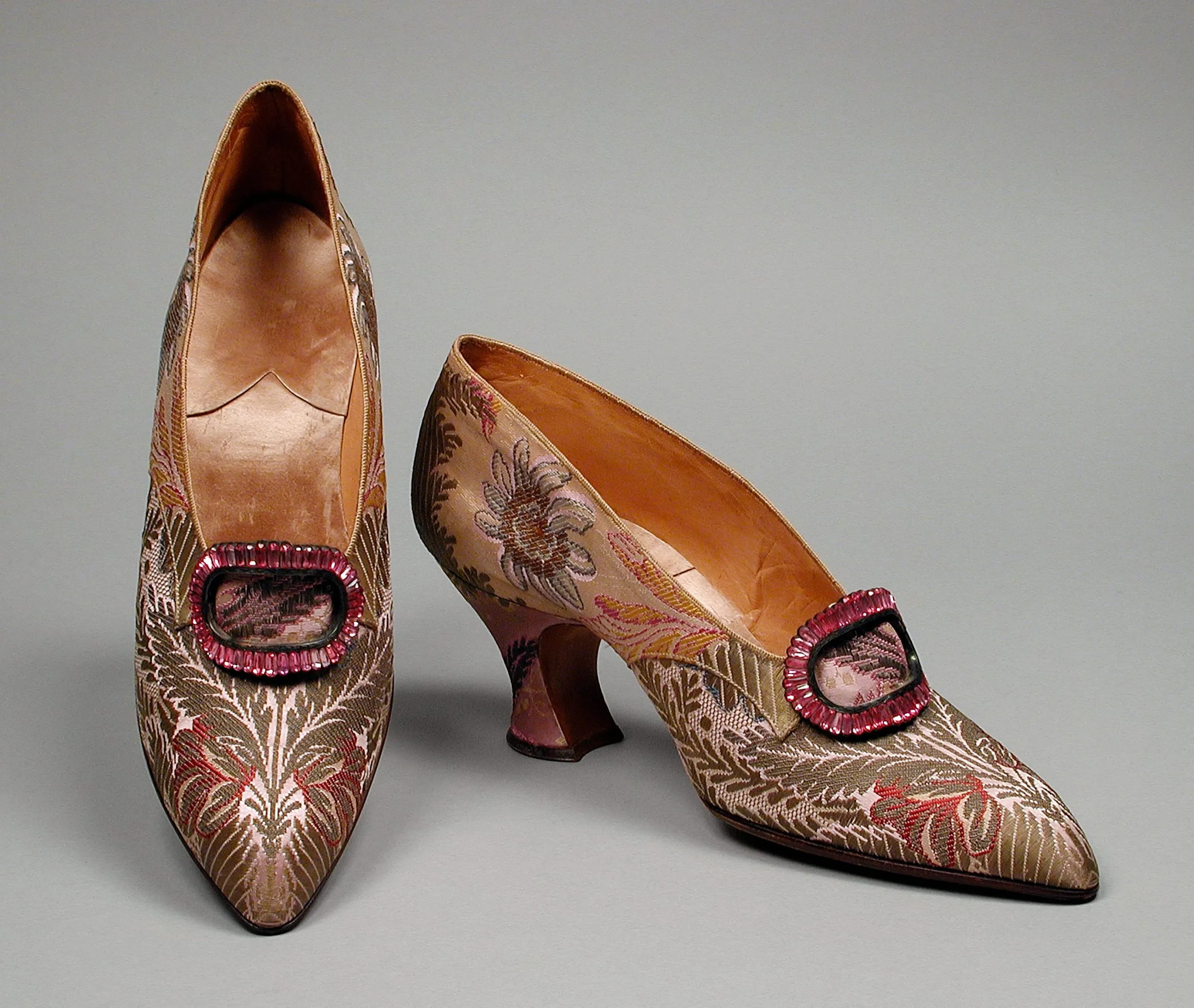Pair of pointed-toe brocade dress shoes with curved heels and rectangular jeweled buckles, displayed one upright and one on its side