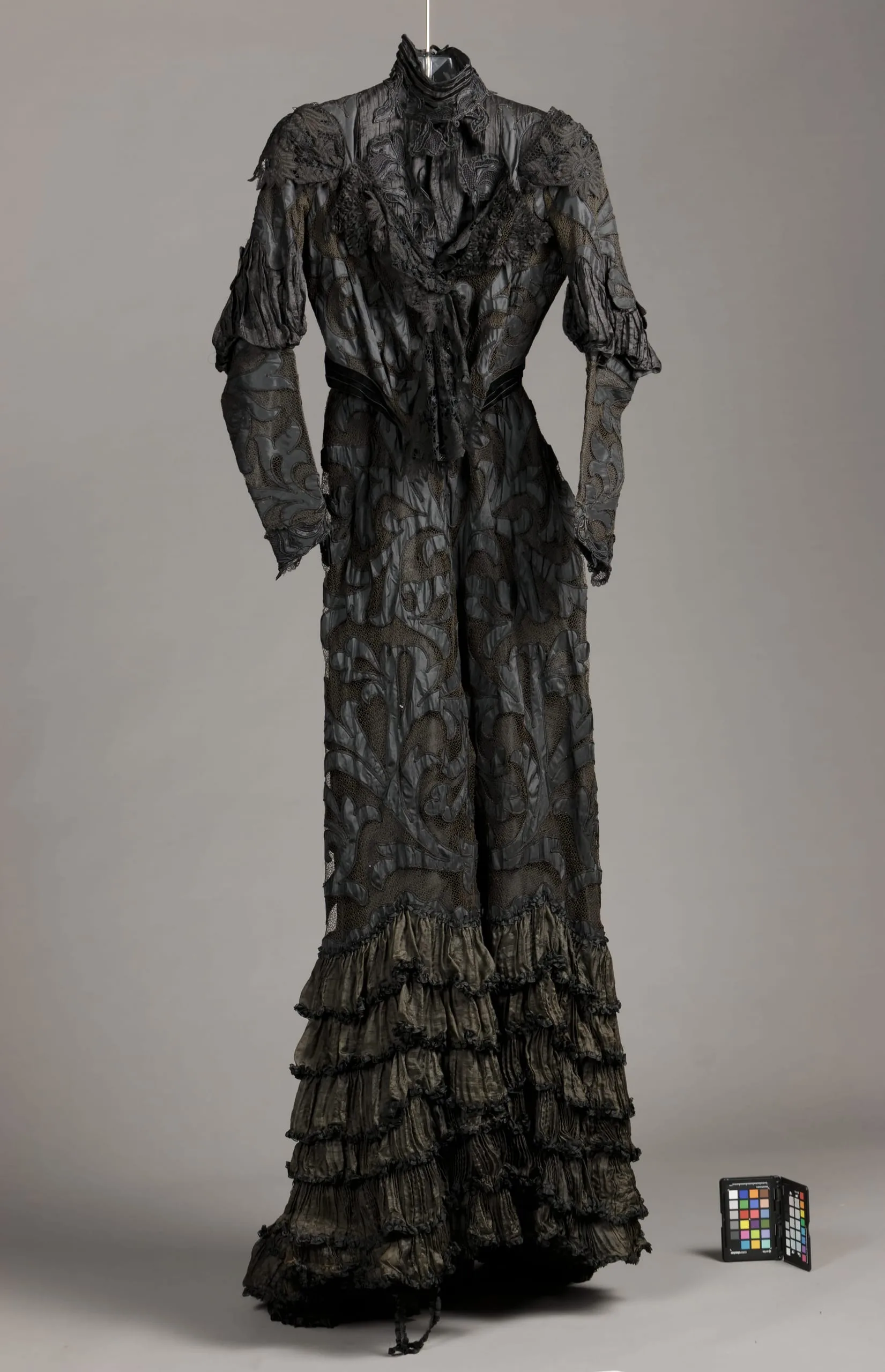 - a) Silk plain weave (taffeta), silk plain weave (chiffon), with silk cording and silk net, and silk velvet trim