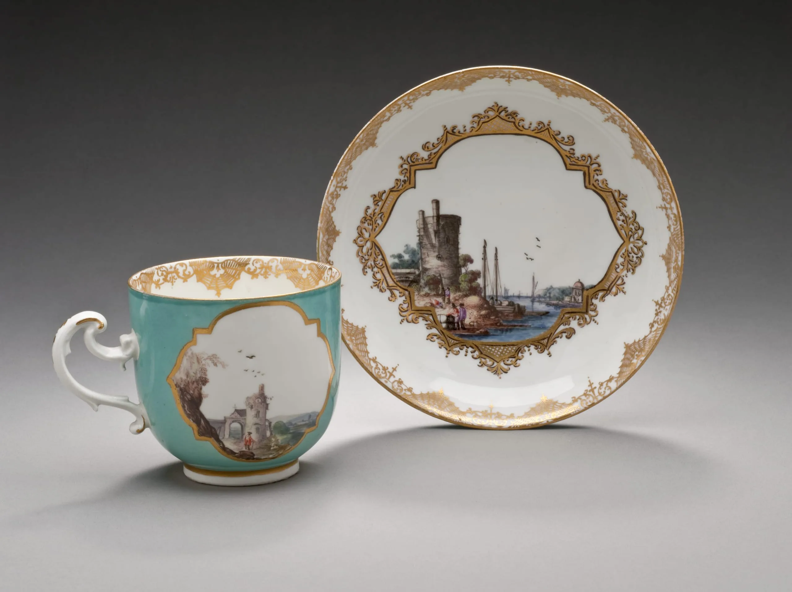 - Pair of Cups and Saucers Decorated with Harbor Scenes