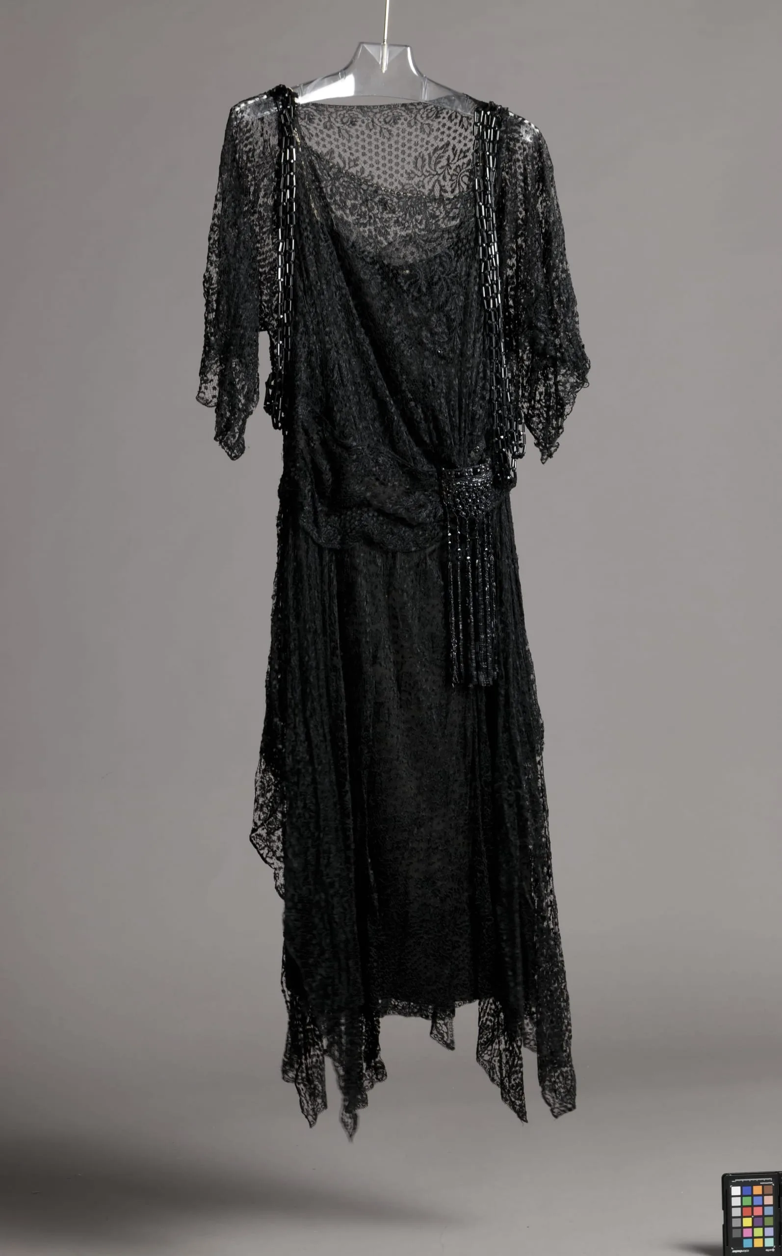 - Rayon lace and rayon plain weave (crepe) with glass beads