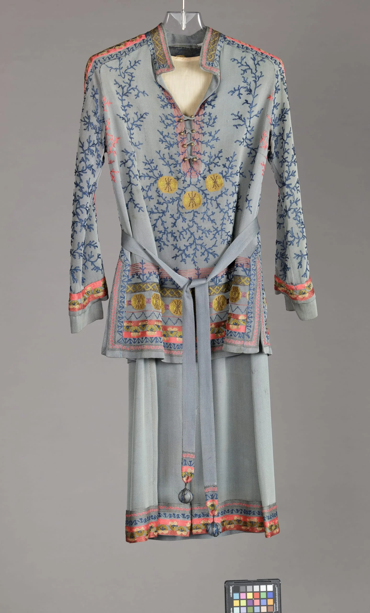 - Silk twill with silk thread and metallic embroidery and metal buttons;