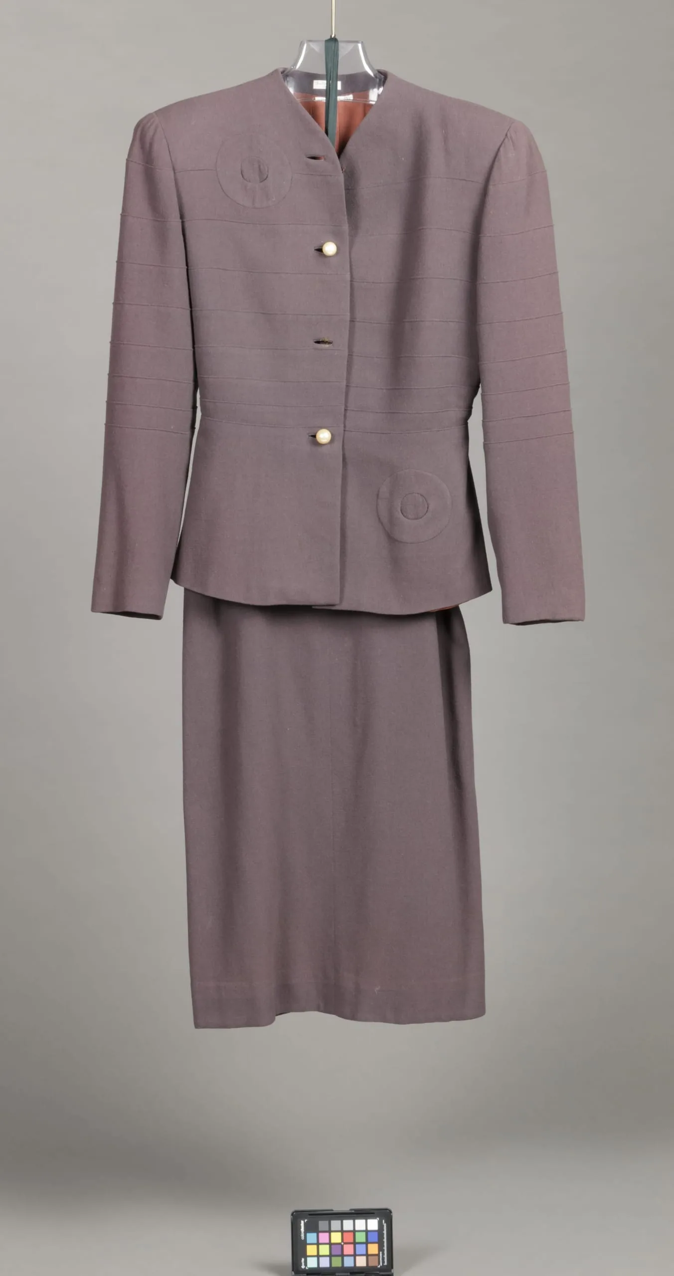 - Jacket: wool plain weave (crepe) with imitation pearl buttons; Skirt: wool plain weave (crepe).