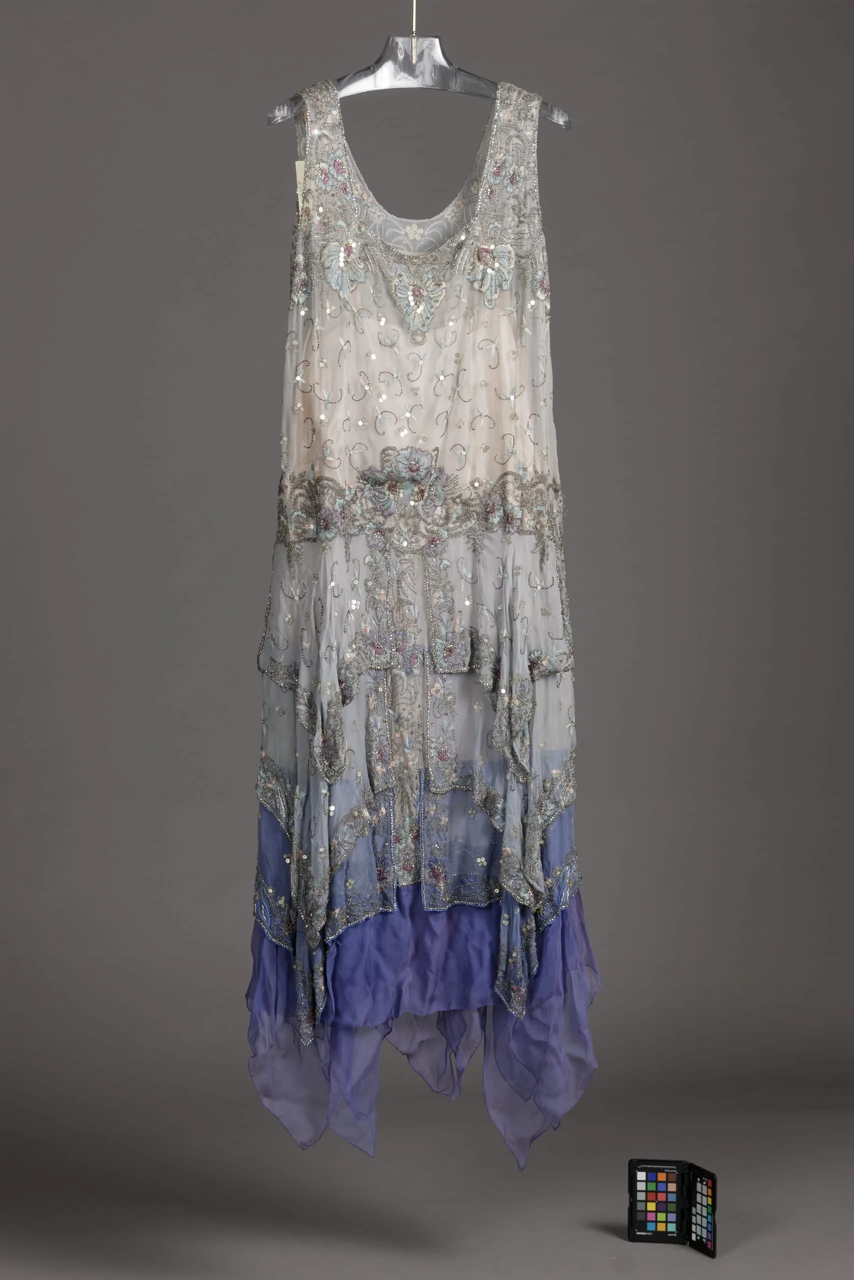 - Dress: silk plain weave (crepe chiffon) with silk embroidery, glass sequins, glass and celluloid beads, and crystals; Slip: silk satin with metallic thread embroidery and silk satin ribbon