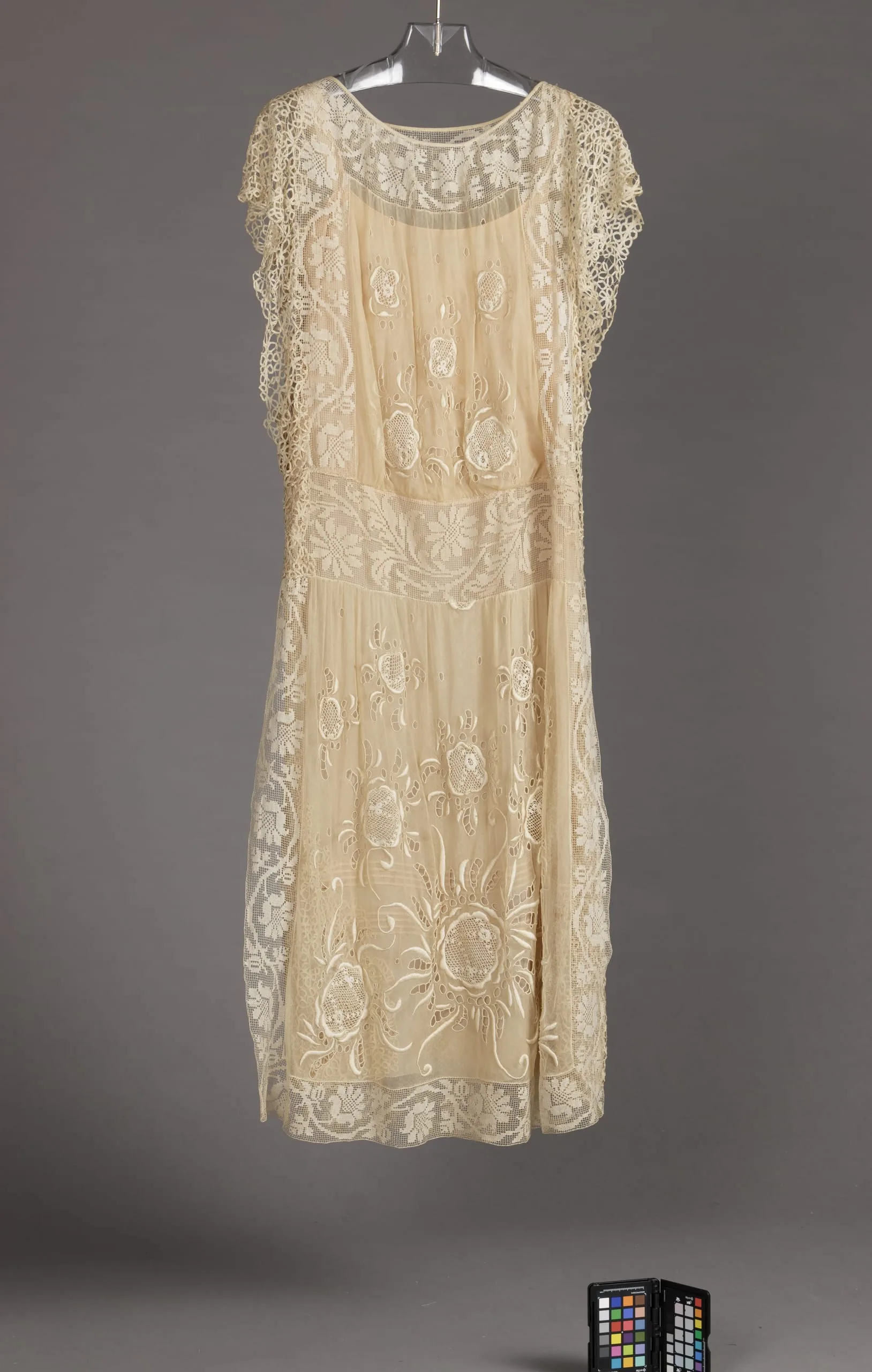 - Silk plain weave (chiffon) with cotton thread embroidery, linen lace, and silk plain weave (crepe)
