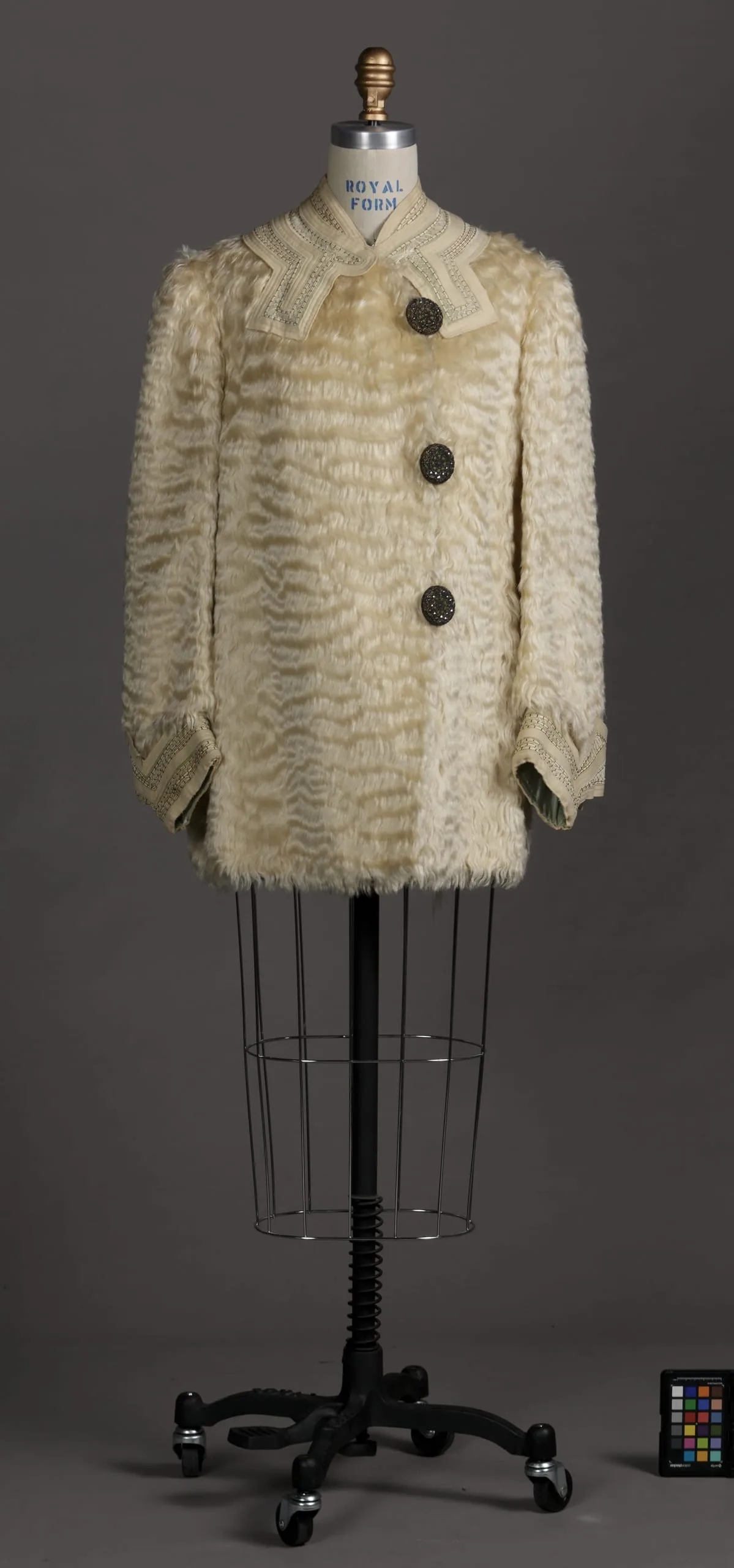 - Silk faux fur on plain weave ground (?), wool plain weave (broadcloth), silk thread and silk cord embroidery, figured metallic buttons