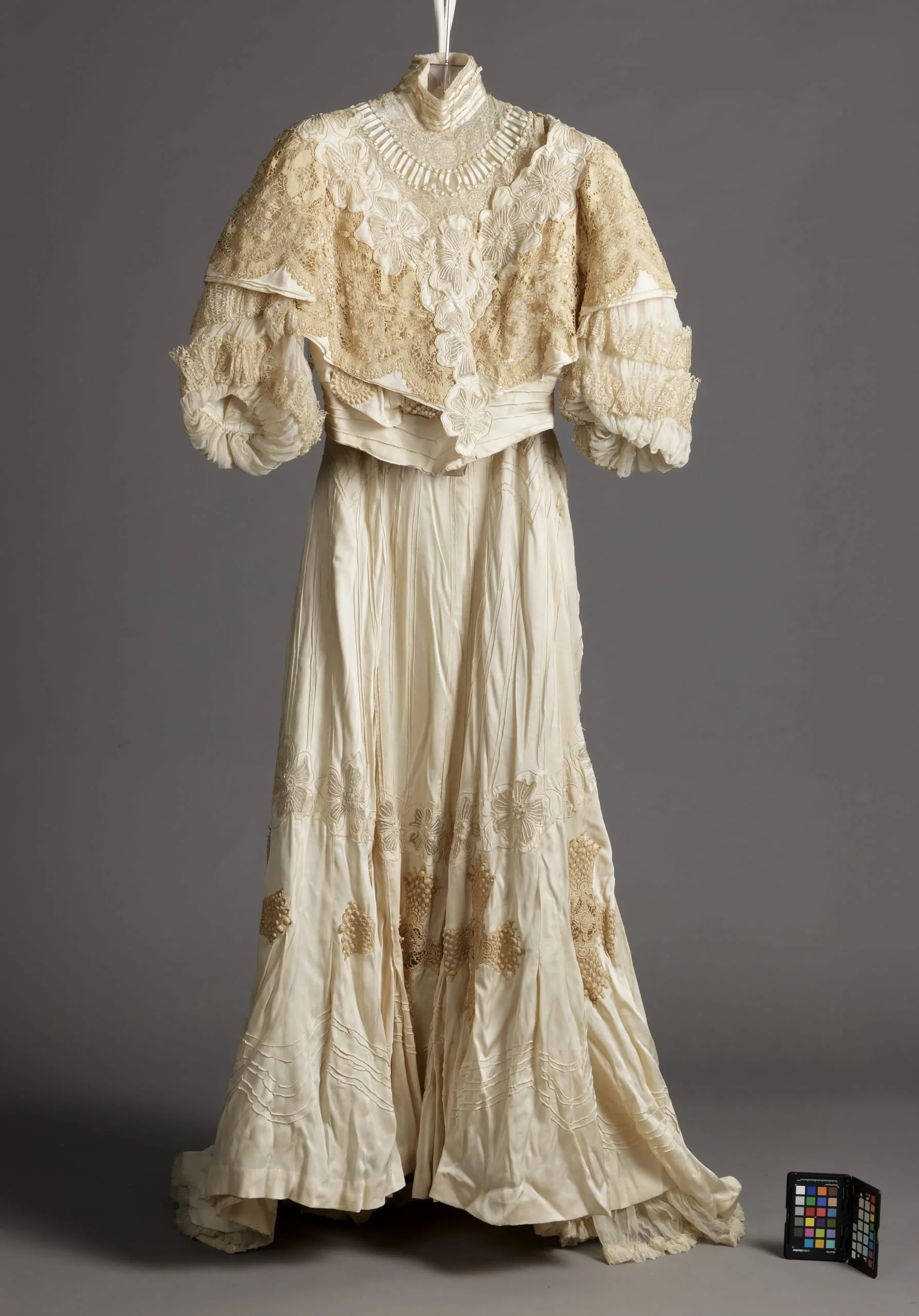 - Bodice: Silk twill with silk plain weave (crepe chiffon), linen lace, silk lace, silk satin ribbon, silk cord, silk embroidery, and silk-thread covered buttons