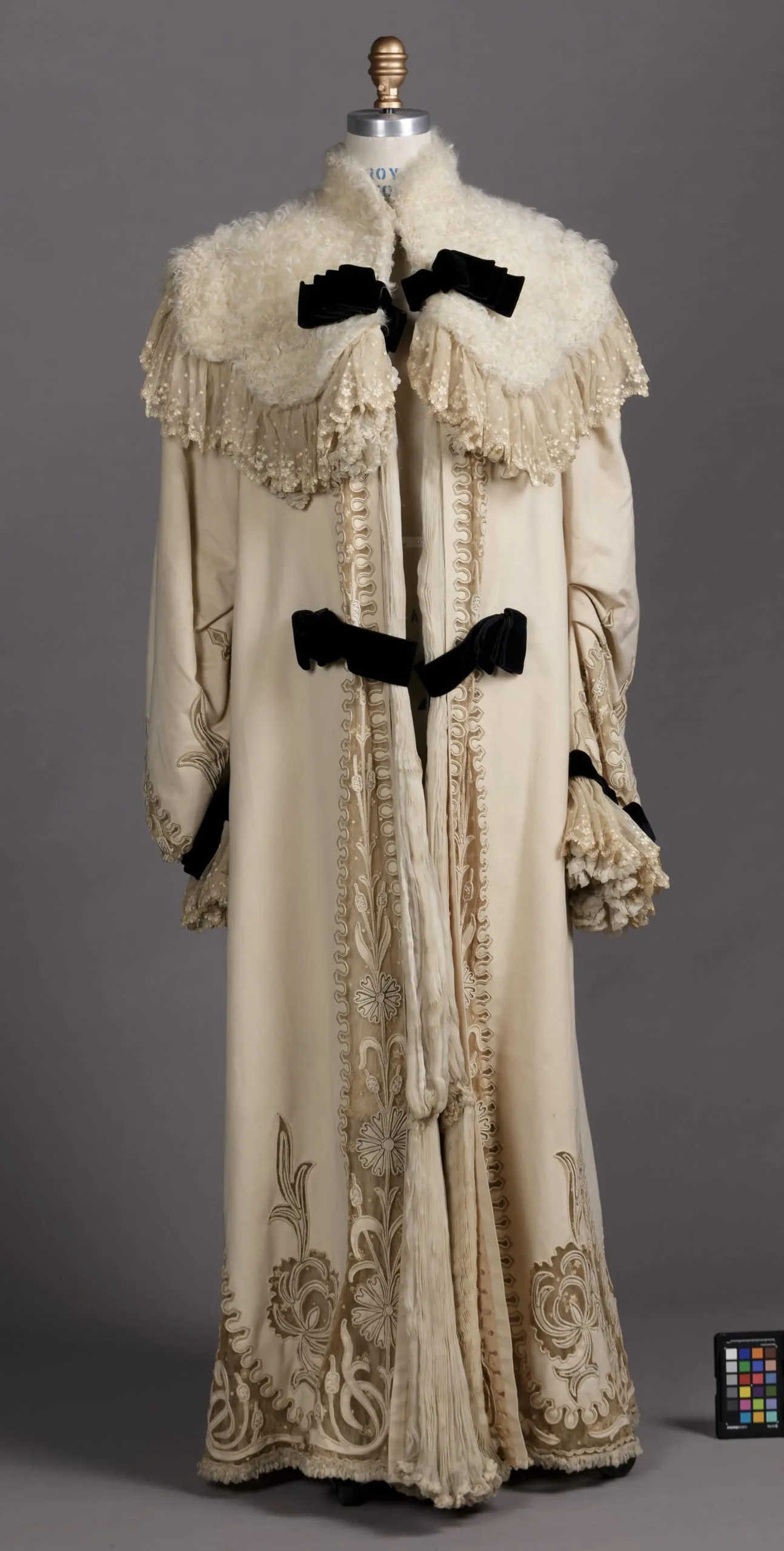- Wool twill (broadcloth) and silk net with silk cord and metallic-thread embroidery, karakul fur, silk plain weave (chiffon), silk lace, and silk velvet ribbon