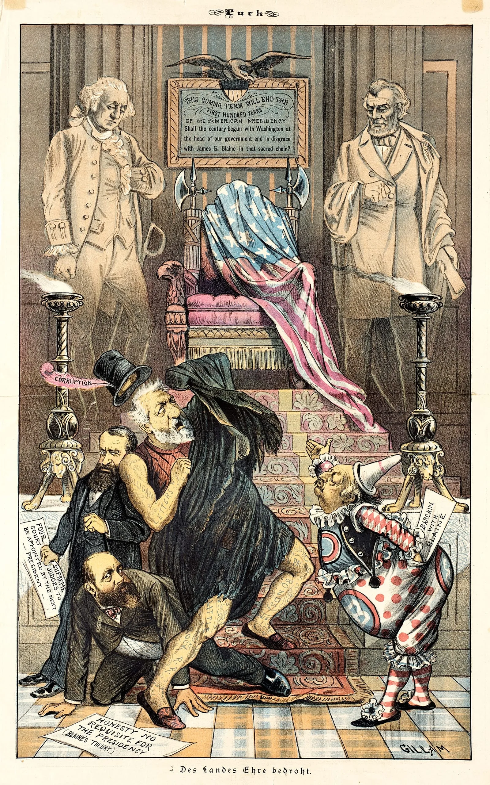 Color political cartoon print with caricatured figures including a skeletal robed figure and a polka-dot jester gathered before a flag-draped throne, flanked by ghostly statesman figures; caption reads 'Des Landes Ehre bedroht'