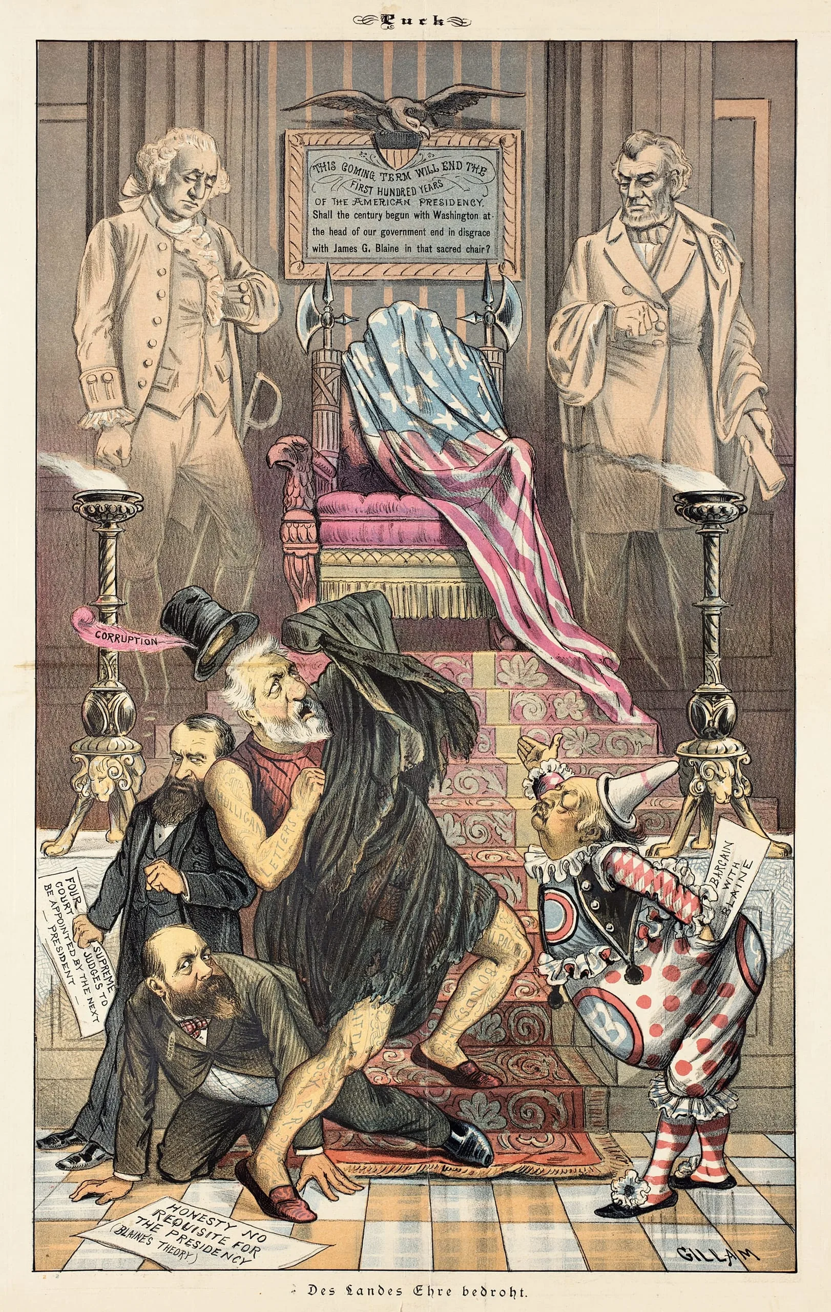 Color political cartoon print from Puck magazine, multiple caricatured figures surrounding an American-flag-draped throne, with ghostly figures above and a clown-costumed figure to the right