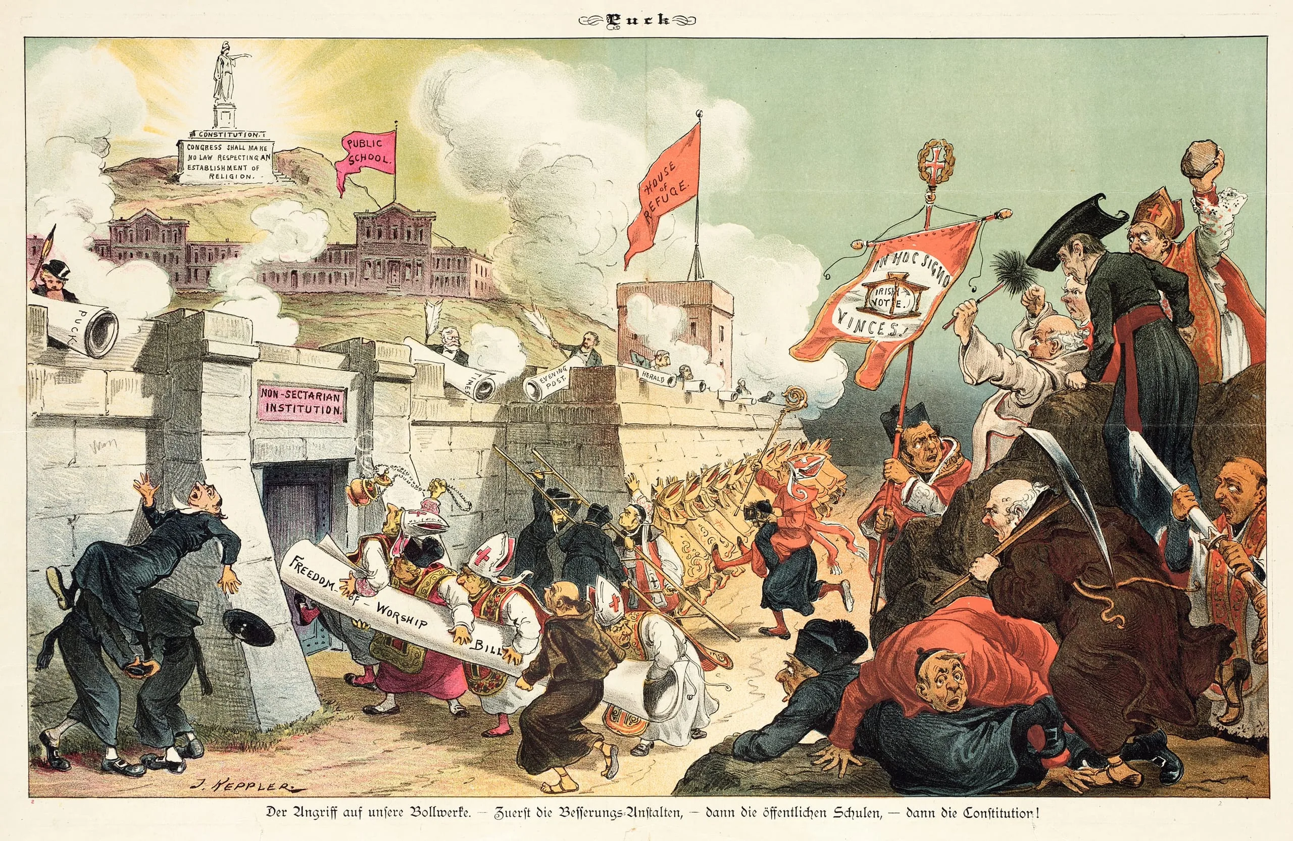 Color print from Puck magazine depicting a crowd of Catholic clerical figures storming a walled fortress labeled 'Non-Sectarian Institution,' with cannons firing and figures carrying banners