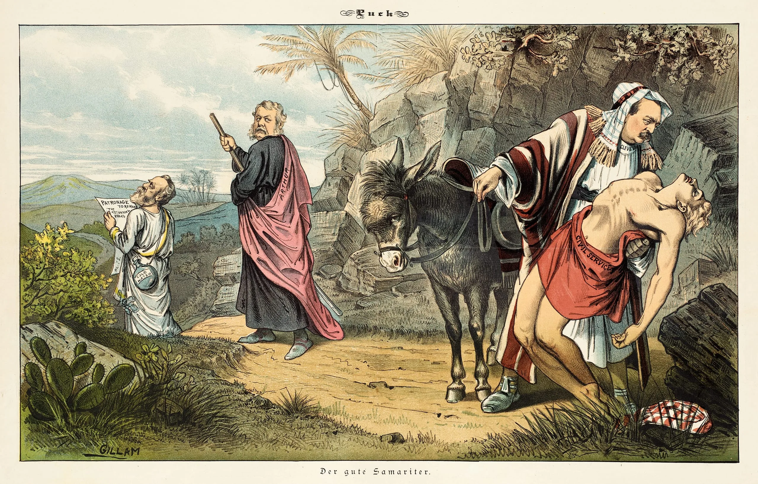 Color chromolithograph from Puck magazine depicting a parody of the Good Samaritan parable, with four caricatured men and a donkey in a rocky landscape; caption reads 'Der gute Samariter'